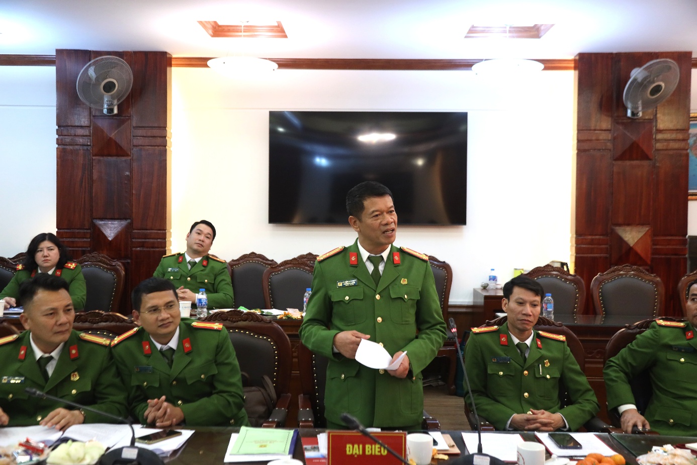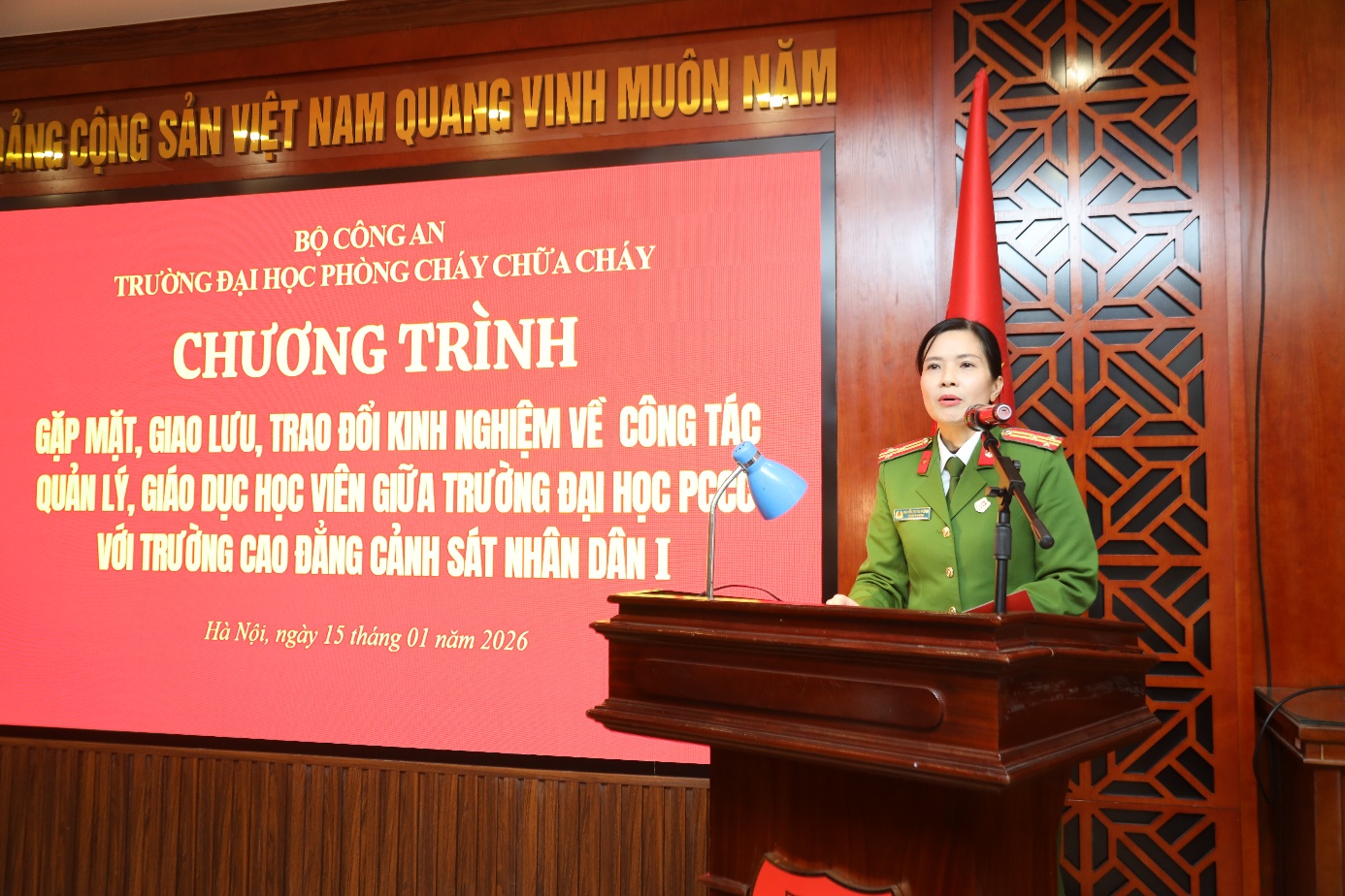 Phát biểu báo cáo, đồng chí Thượng tá Nguyễn Thị Thu Hường, Trưởng phòng Quản lý học viên Trường Cao đẳng Cảnh sát nhân dân I và đồng chí Thượng tá Phạm Thanh Tùng, Trưởng phòng Quản lý học viên Trường Đại học Phòng cháy chữa cháy đã đánh giá khái quát về công tác quản lý, giáo dục học viên, những mô hình, phương pháp, biện pháp tổ chức quản lý mà đơn vị đã áp dụng trong thực tiễn nhằm nâng cao hiệu quả công tác quản lý, giáo dục học viên. Đồng thời trao đổi, chia sẻ những kinh nghiệm, những sáng kiến đổi mới, mô hình quản lý hiệu quả, những khó khăn, vướng mắc trong việc xử lý đối với một số lỗi vi phạm quy định trong khung xử lý kỷ luật học viên tại Thông tư 119 và phương hướng, nhiệm vụ, giải pháp nhằm nâng cao chất lượng công tác Quản lý học viên tại Nhà trường. Thông qua buổi buổi gặp gỡ, làm việc cũng mong muốn trong thời gian tới được thường xuyên trao đổi kinh nghiệm về công tác quản lý, giáo dục học viên để tăng thêm mối quan hệ bền chặt giữa hai đơn vị.