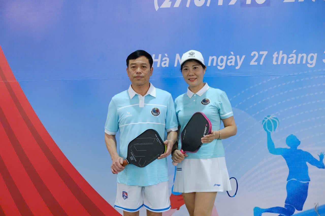 Đồng chí TS, Đại tá Lê Quang Vịnh, Phó Giám đốc Học viện Quốc tế trao giải thưởng cho các đồng chí đạt giải nội dung Đôi nam, nữ lãnh đạo môn Pickleball.