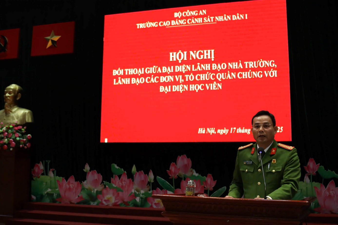 Thực hiện Thông tư của Bộ trưởng Bộ Công an quy định về công tác quản lý giáo dục học viên các trường Công an nhân dân, ngày 17/12/2025, Trường Cao đẳng CSND I tổ chức Hội nghị đối thoại giữa đại diện lãnh đạo nhà trường, đại diện lãnh đạo các đơn vị, tổ chức quần chúng với đại diện học viên.