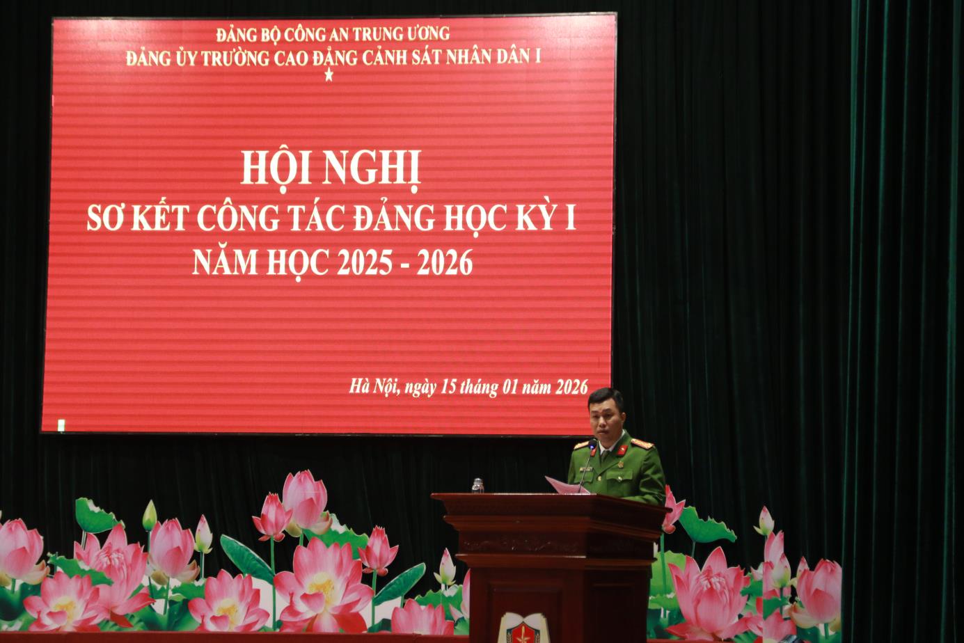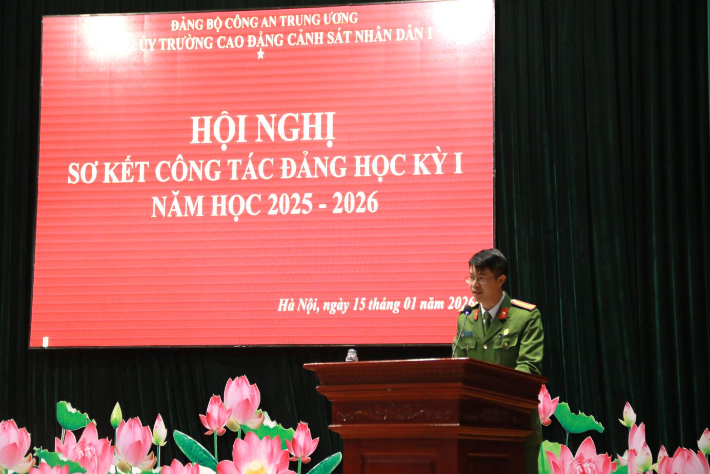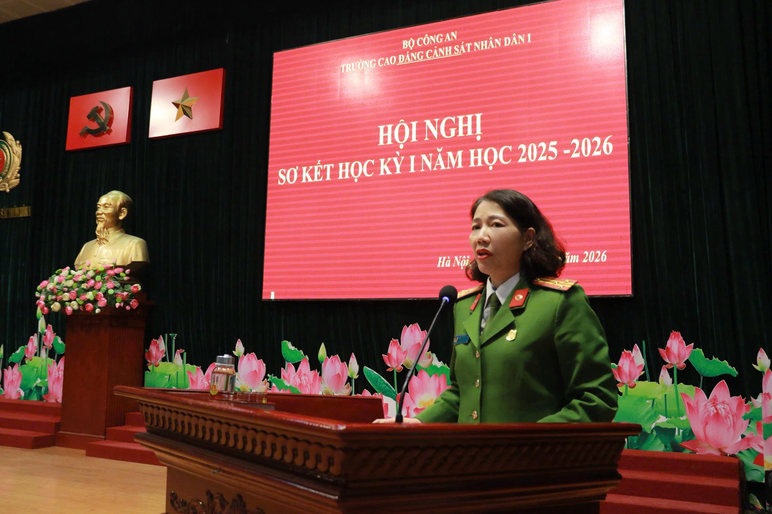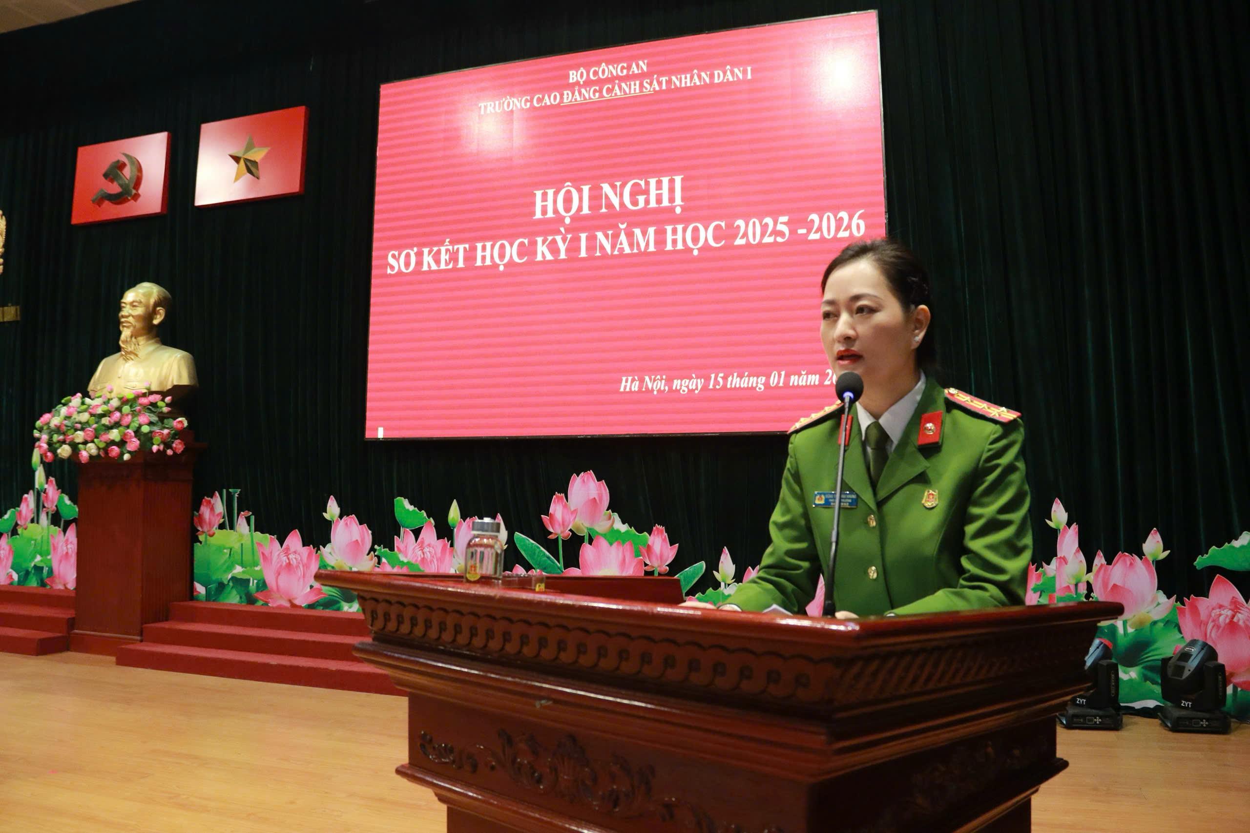 Tại Hội nghị, đồng chí TS, Đại tá Hà Thanh Sơn, Ủy viên Ban Thường vụ Đảng ủy, Phó Hiệu trưởng trình bày Báo cáo tóm tắt kết quả công tác Đảng học kỳ I năm học 2025-2026. Báo cáo đã khẳng định: Học kỳ I năm học 2025-2026 Đảng ủy nhà trường đã lãnh đạo, chỉ đạo triển khai các mặt công tác của Nhà trường theo đúng Chương trình công tác năm học. Nổi bật nhất, lãnh đạo, chỉ đạo tổ chức chuỗi các hoạt động chào mừng kỷ niệm 60 năm Ngày Truyền thống Trường Cao đẳng CSND I và Lễ kỷ niệm trang trọng, ý nghĩa, được Lãnh đạo Bộ Công an đánh giá cao. Đồng thời dưới sự lãnh đạo của Đảng uỷ, Đảng bộ nhà trường đã đạt được những kết quả tích cực trên các lĩnh vực công tác giáo dục đào tạo, nghiên cứu khoa học, đảm bảo chất lượng đào tạo; công tác giáo dục quản lý học viên; công tác hành chính tổng hợp; công tác hậu cần, đời sống; công tác xây dựng Đảng, xây dựng lực lượng ...