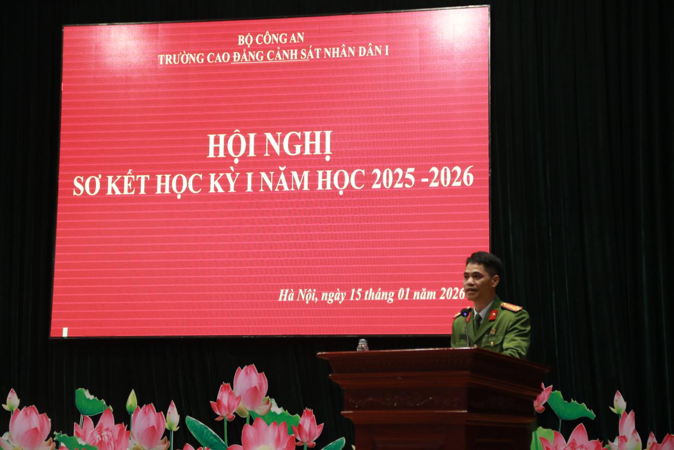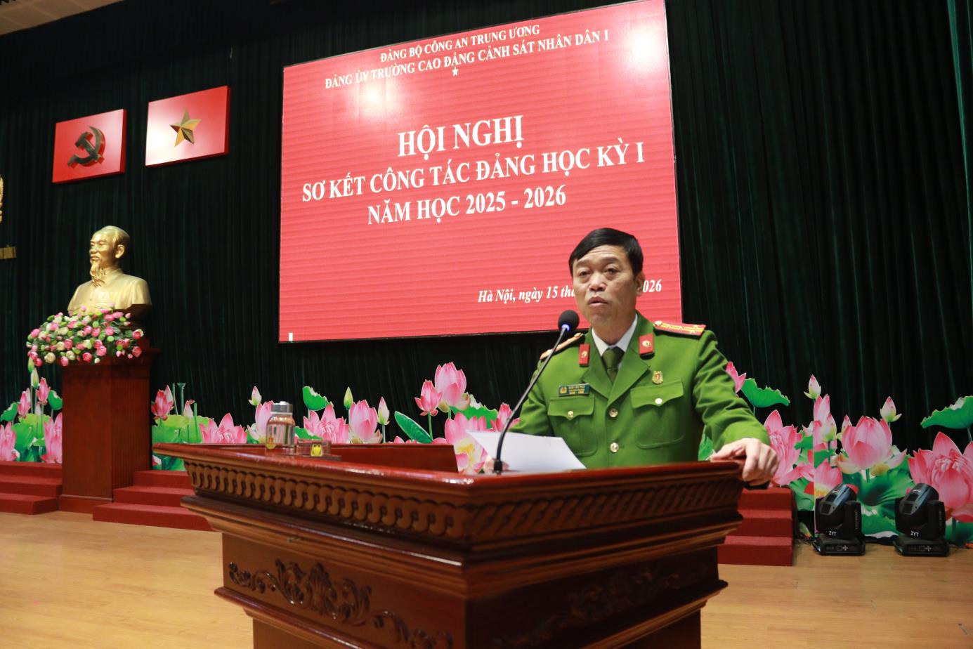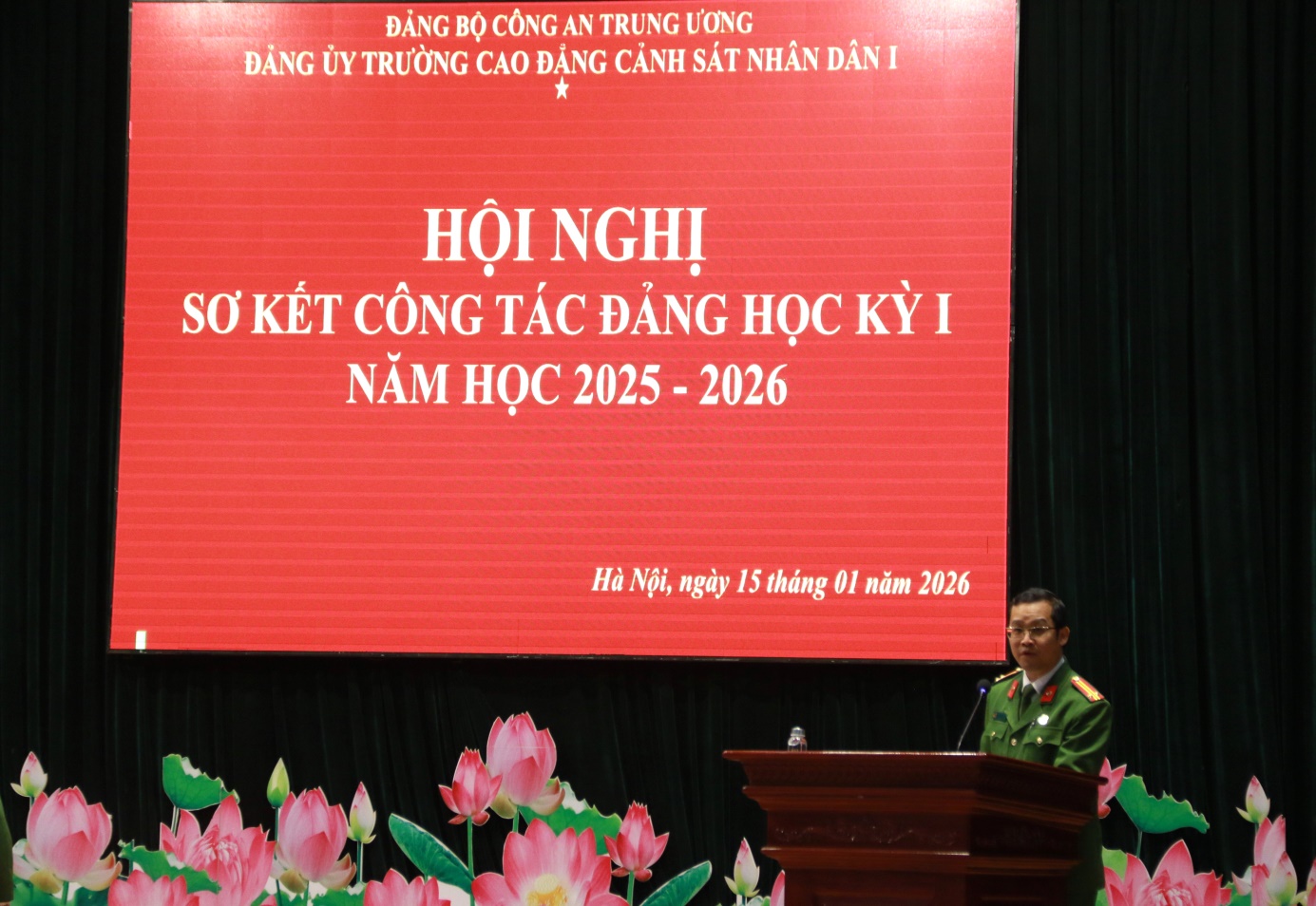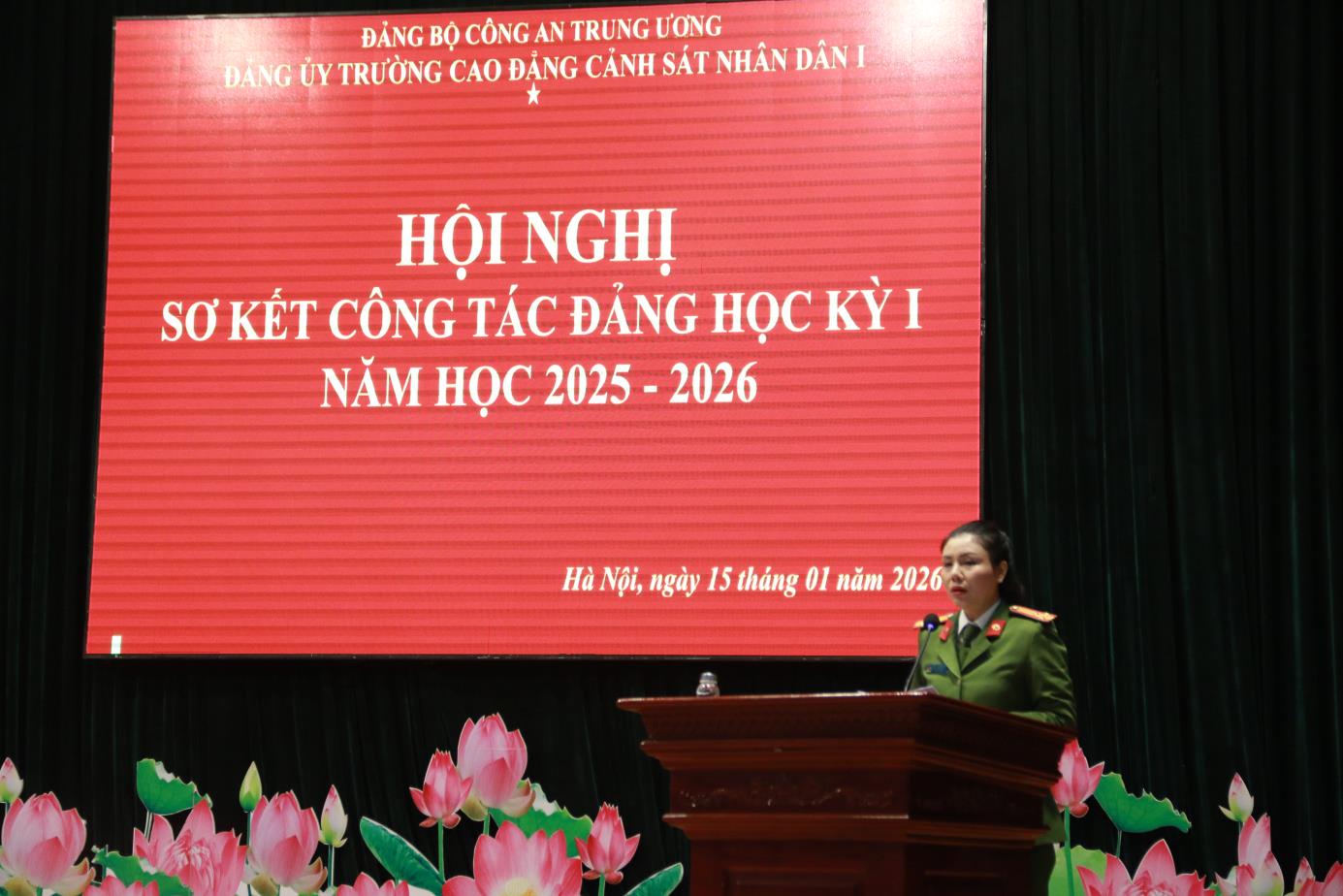 Tại Hội nghị, đồng chí TS, Đại tá Hà Thanh Sơn, Ủy viên Ban Thường vụ Đảng ủy, Phó Hiệu trưởng trình bày Báo cáo tóm tắt kết quả công tác Đảng học kỳ I năm học 2025-2026. Báo cáo đã khẳng định: Học kỳ I năm học 2025-2026 Đảng ủy nhà trường đã lãnh đạo, chỉ đạo triển khai các mặt công tác của Nhà trường theo đúng Chương trình công tác năm học. Nổi bật nhất, lãnh đạo, chỉ đạo tổ chức chuỗi các hoạt động chào mừng kỷ niệm 60 năm Ngày Truyền thống Trường Cao đẳng CSND I và Lễ kỷ niệm trang trọng, ý nghĩa, được Lãnh đạo Bộ Công an đánh giá cao. Đồng thời dưới sự lãnh đạo của Đảng uỷ, Đảng bộ nhà trường đã đạt được những kết quả tích cực trên các lĩnh vực công tác giáo dục đào tạo, nghiên cứu khoa học, đảm bảo chất lượng đào tạo; công tác giáo dục quản lý học viên; công tác hành chính tổng hợp; công tác hậu cần, đời sống; công tác xây dựng Đảng, xây dựng lực lượng ...