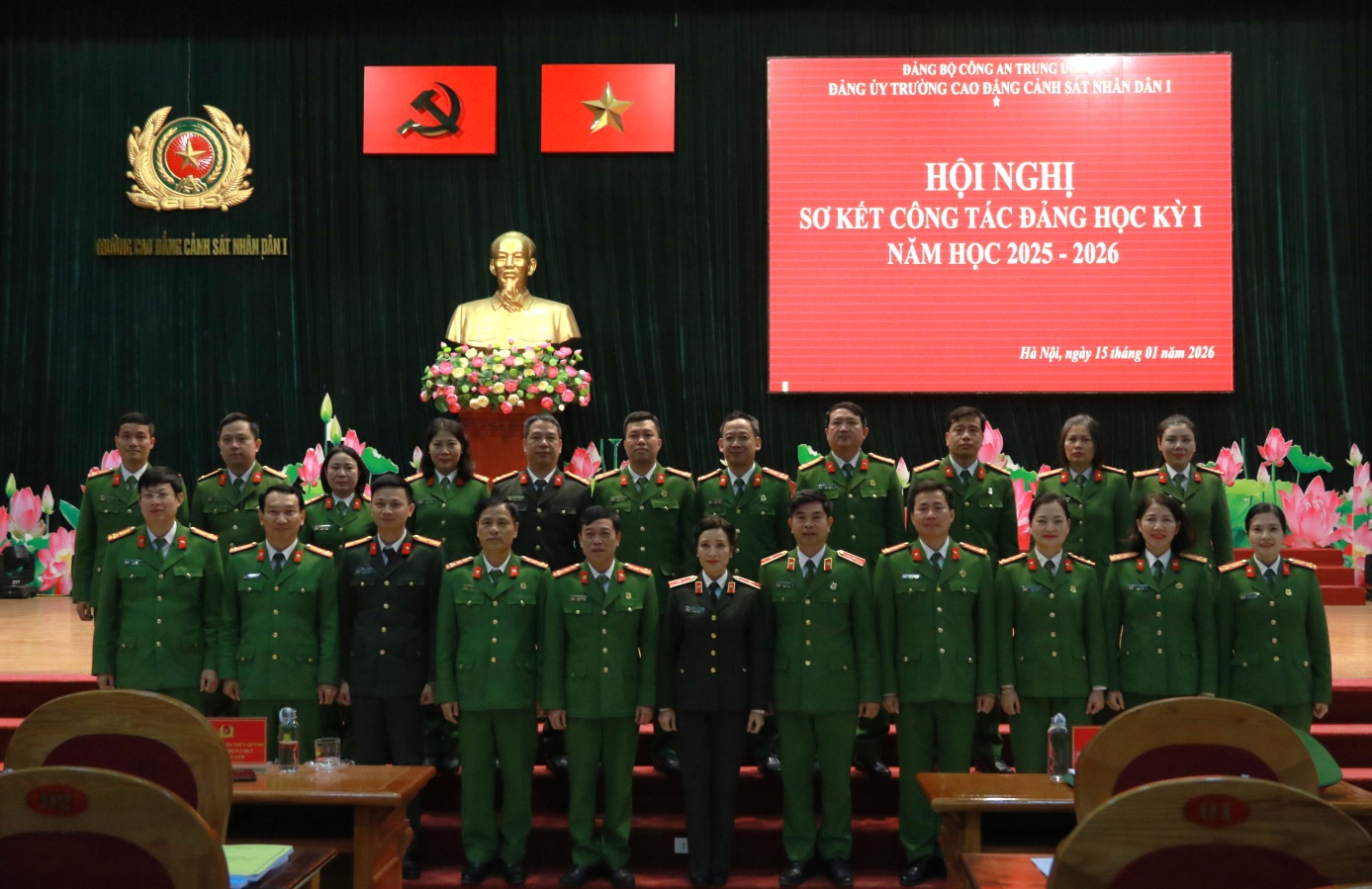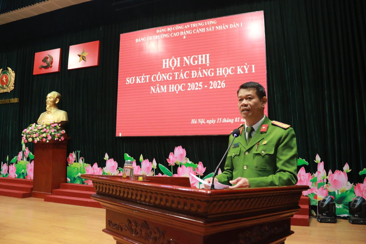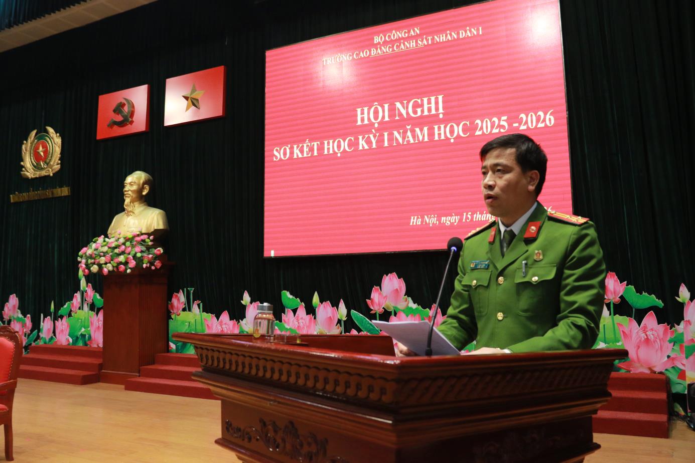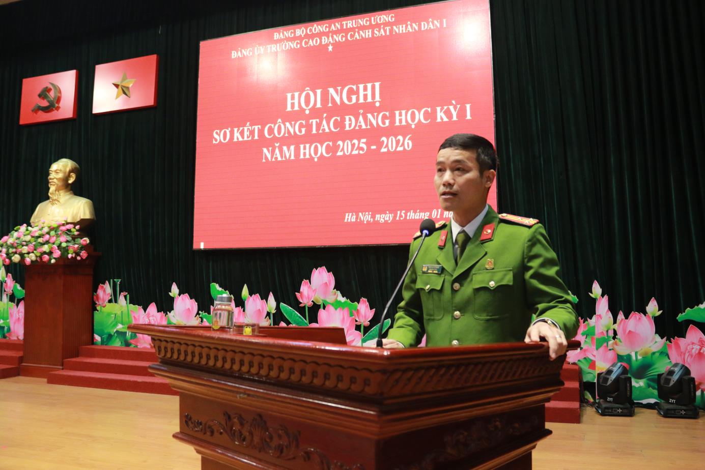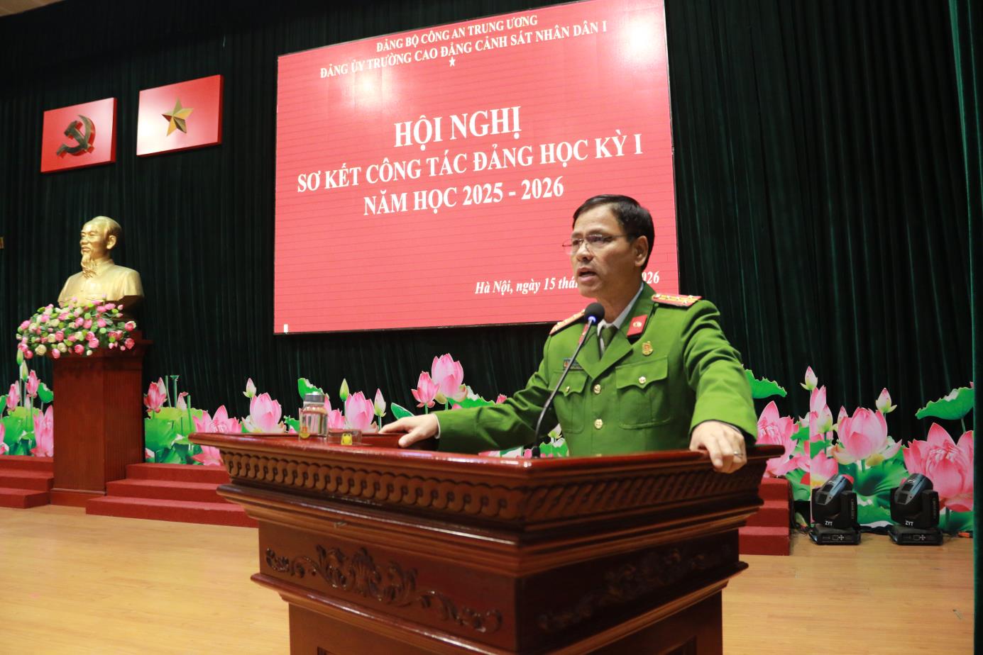 Tại Hội nghị, đồng chí TS, Đại tá Hà Thanh Sơn, Ủy viên Ban Thường vụ Đảng ủy, Phó Hiệu trưởng trình bày Báo cáo tóm tắt kết quả công tác Đảng học kỳ I năm học 2025-2026. Báo cáo đã khẳng định: Học kỳ I năm học 2025-2026 Đảng ủy nhà trường đã lãnh đạo, chỉ đạo triển khai các mặt công tác của Nhà trường theo đúng Chương trình công tác năm học. Nổi bật nhất, lãnh đạo, chỉ đạo tổ chức chuỗi các hoạt động chào mừng kỷ niệm 60 năm Ngày Truyền thống Trường Cao đẳng CSND I và Lễ kỷ niệm trang trọng, ý nghĩa, được Lãnh đạo Bộ Công an đánh giá cao. Đồng thời dưới sự lãnh đạo của Đảng uỷ, Đảng bộ nhà trường đã đạt được những kết quả tích cực trên các lĩnh vực công tác giáo dục đào tạo, nghiên cứu khoa học, đảm bảo chất lượng đào tạo; công tác giáo dục quản lý học viên; công tác hành chính tổng hợp; công tác hậu cần, đời sống; công tác xây dựng Đảng, xây dựng lực lượng ...