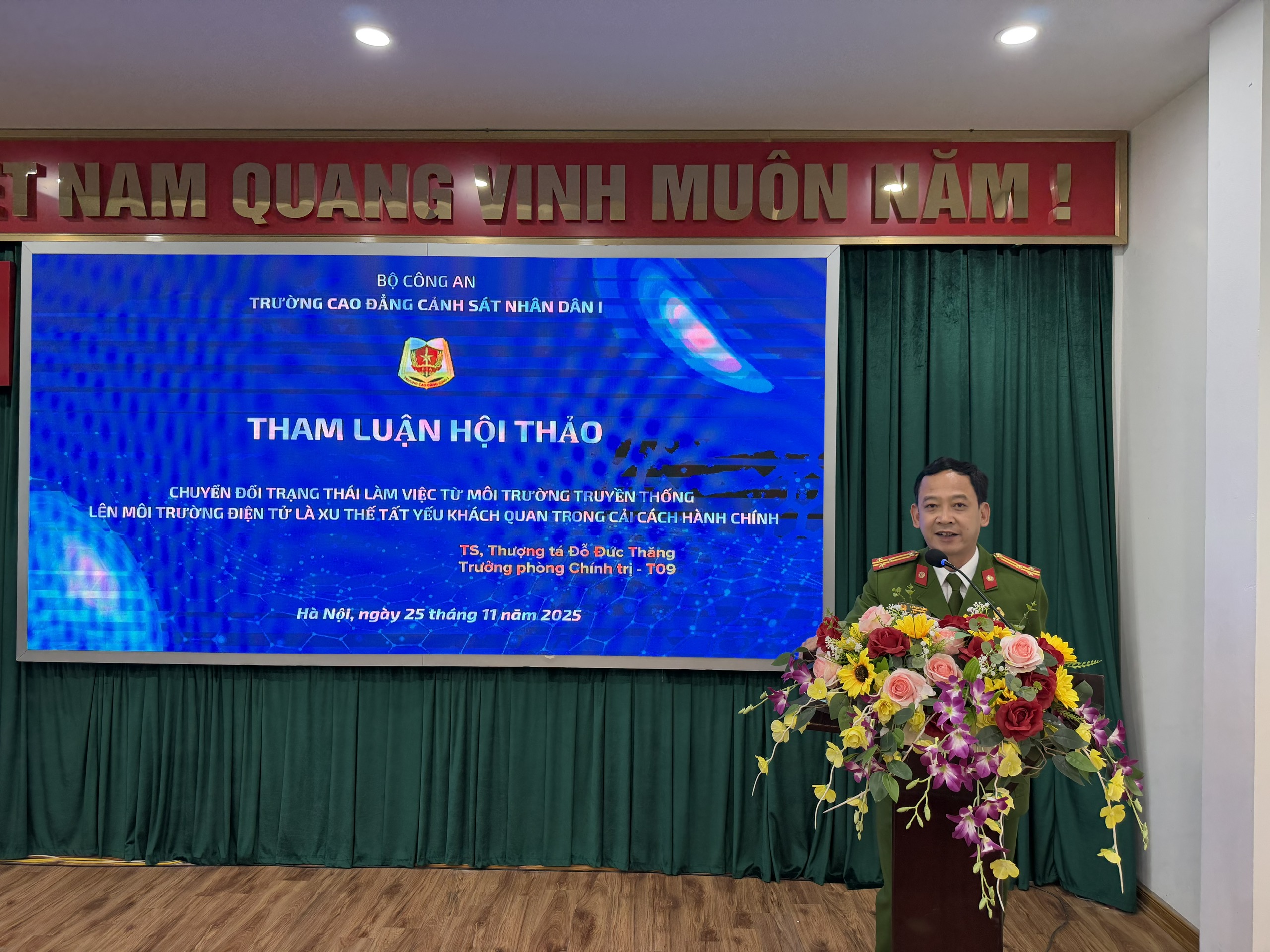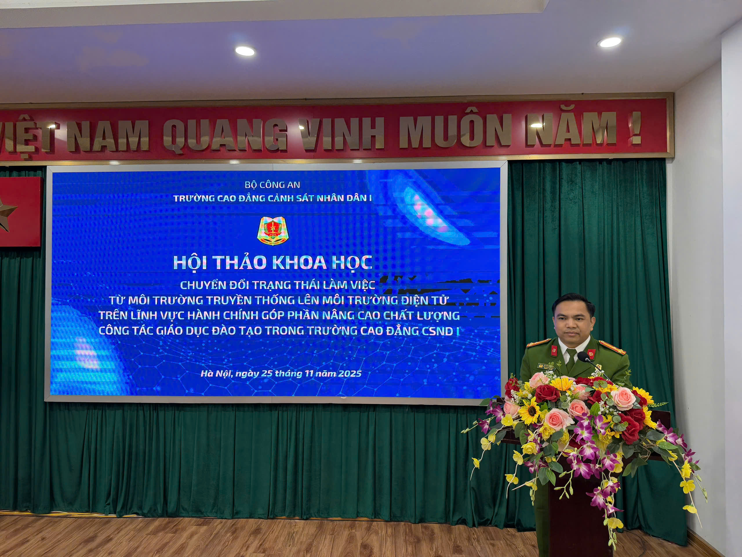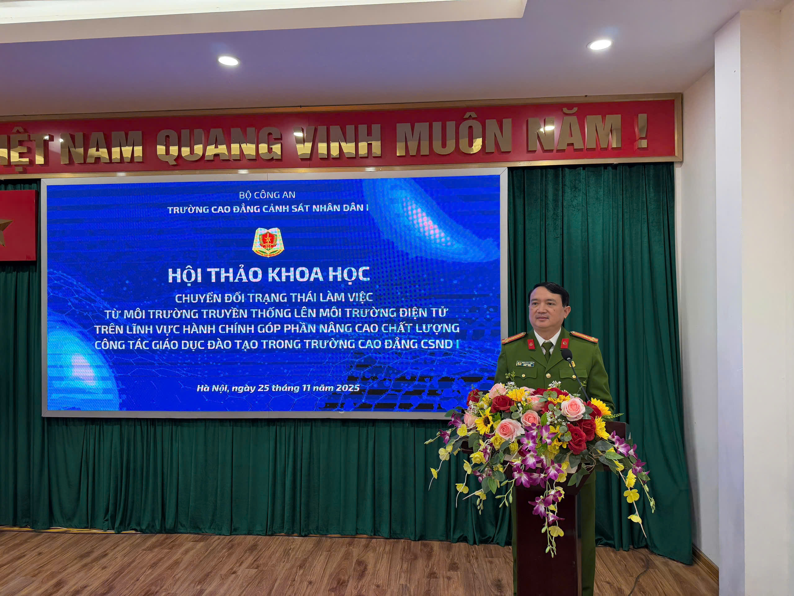 Sáng ngày 25/11/2025, Trường Cao đẳng Cảnh sát nhân dân I tổ chức Hội thảo khoa học với chủ đề “Chuyển đổi trạng thái làm việc từ môi trường truyền thống lên môi trường điện tử trên lĩnh vực hành chính góp phần nâng cao chất lượng công tác giáo dục đào tạo”. Với hình thức Hội thảo không giấy tờ, Hội thảo diễn ra trong bối cảnh toàn lực lượng đang thúc đẩy mạnh mẽ công cuộc chuyển đổi số, coi đây là hướng đi tất yếu nhằm hiện đại hóa phương thức làm việc, tăng tính minh bạch và nâng cao hiệu quả phục vụ trong Công an nhân dân.
