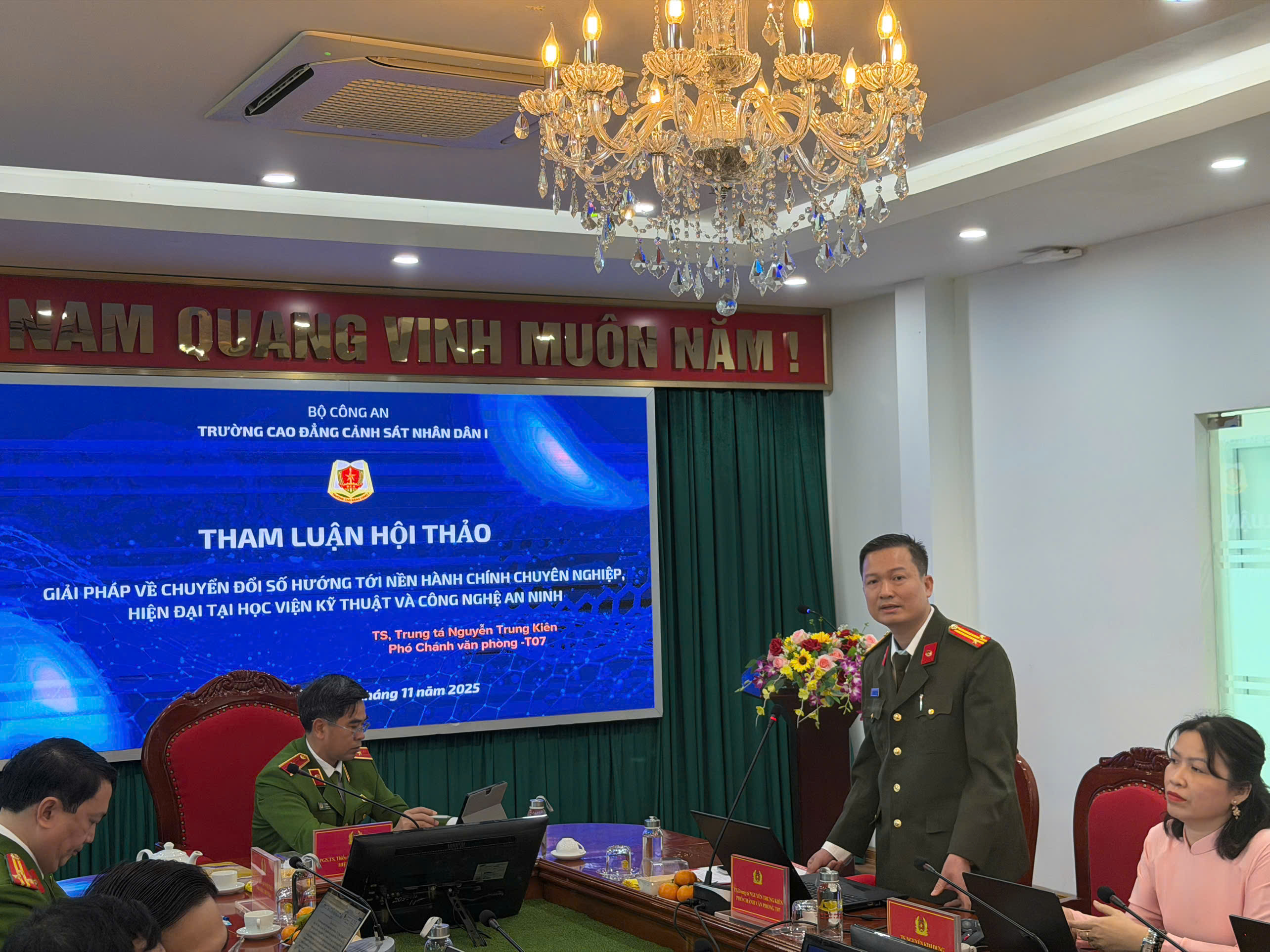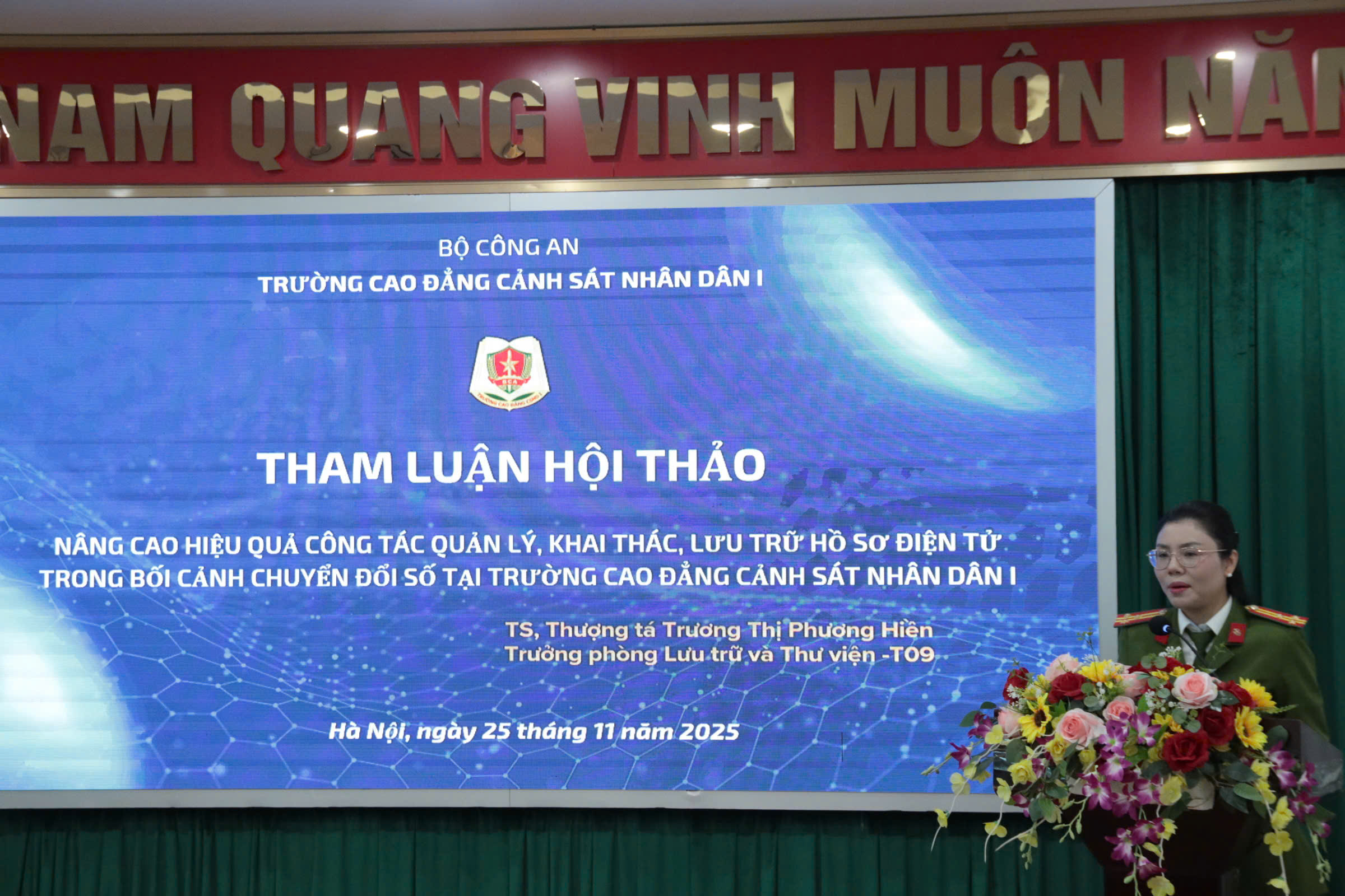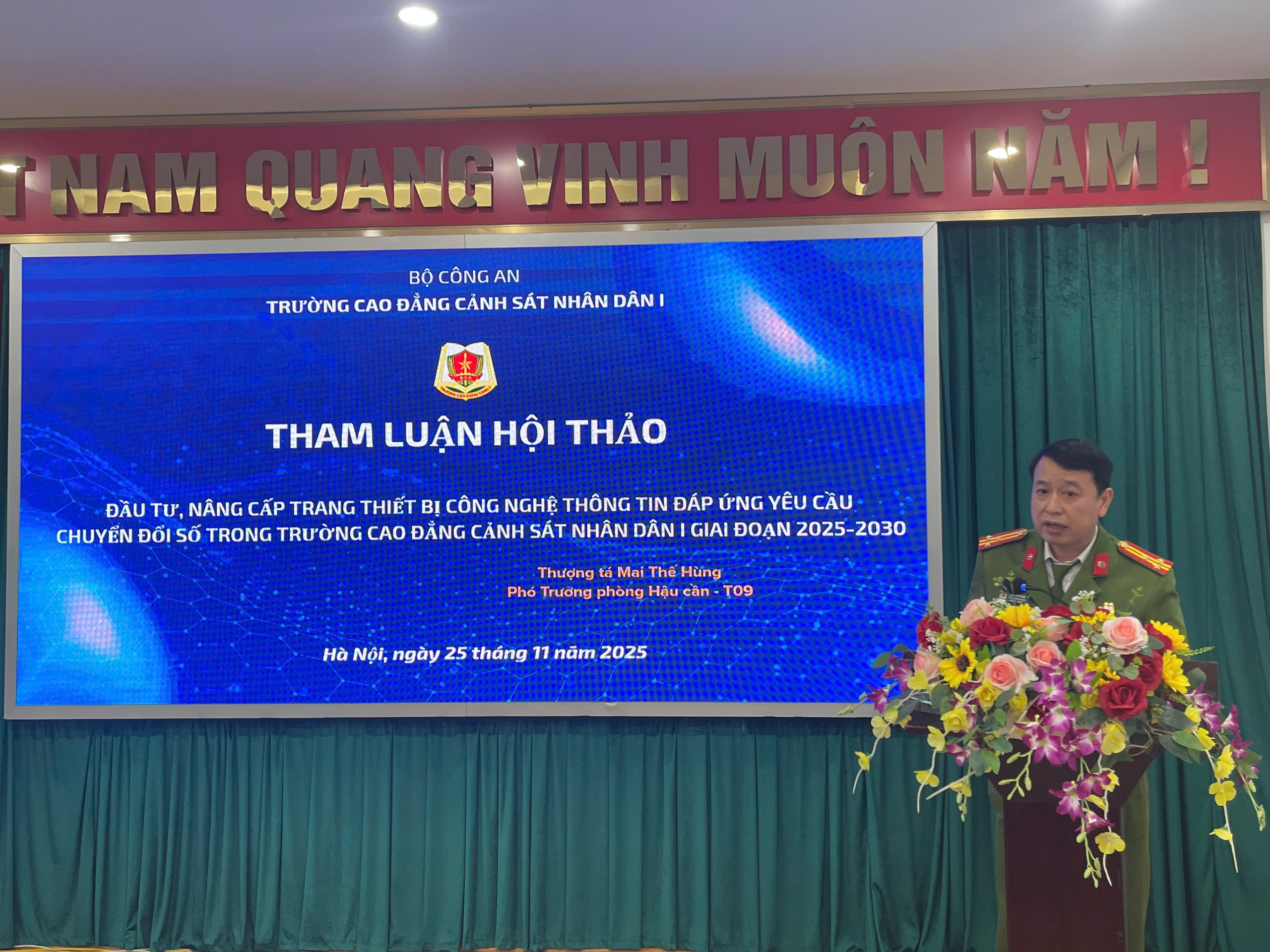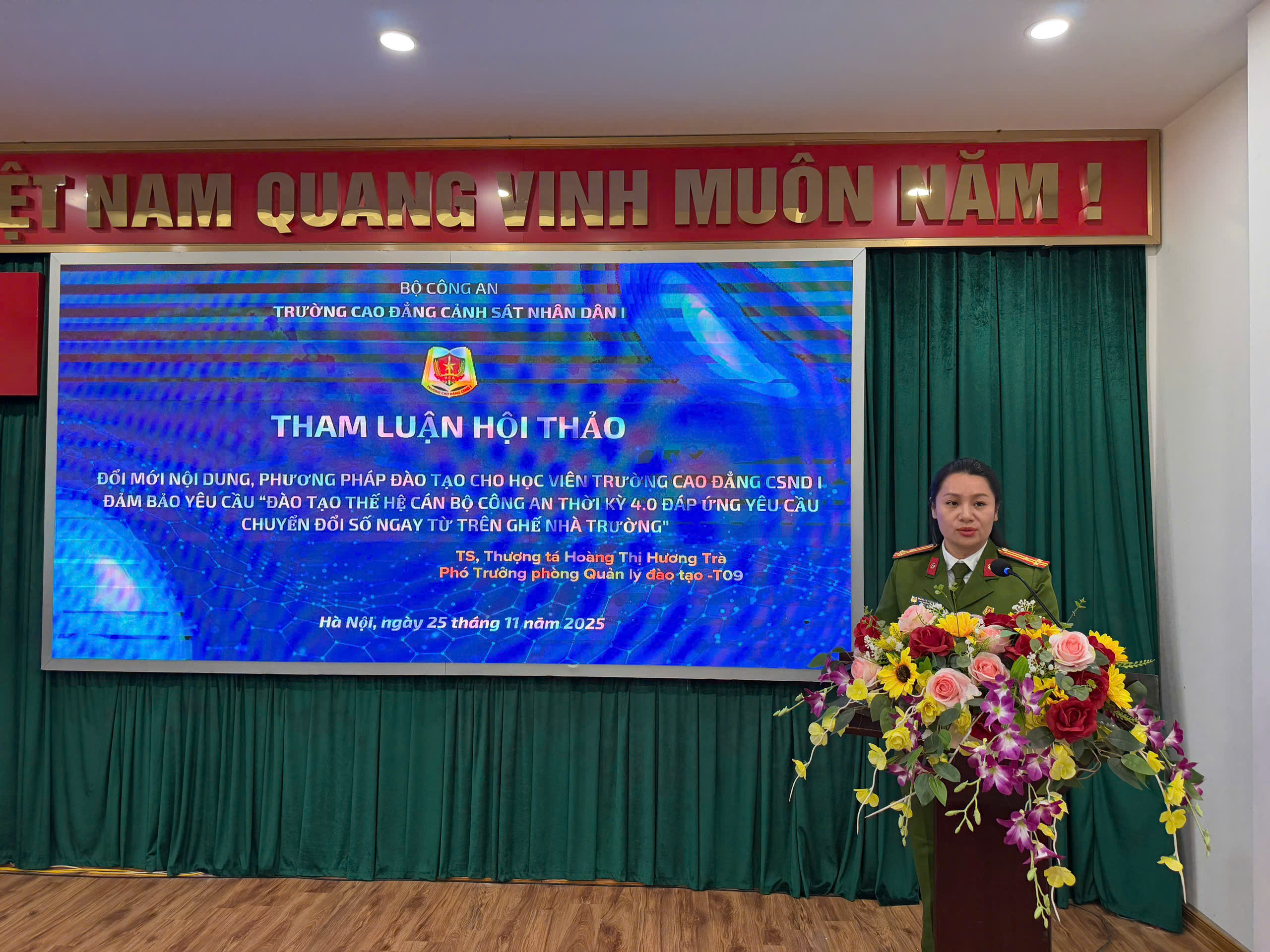 Sáng ngày 25/11/2025, Trường Cao đẳng Cảnh sát nhân dân I tổ chức Hội thảo khoa học với chủ đề “Chuyển đổi trạng thái làm việc từ môi trường truyền thống lên môi trường điện tử trên lĩnh vực hành chính góp phần nâng cao chất lượng công tác giáo dục đào tạo”. Với hình thức Hội thảo không giấy tờ, Hội thảo diễn ra trong bối cảnh toàn lực lượng đang thúc đẩy mạnh mẽ công cuộc chuyển đổi số, coi đây là hướng đi tất yếu nhằm hiện đại hóa phương thức làm việc, tăng tính minh bạch và nâng cao hiệu quả phục vụ trong Công an nhân dân.