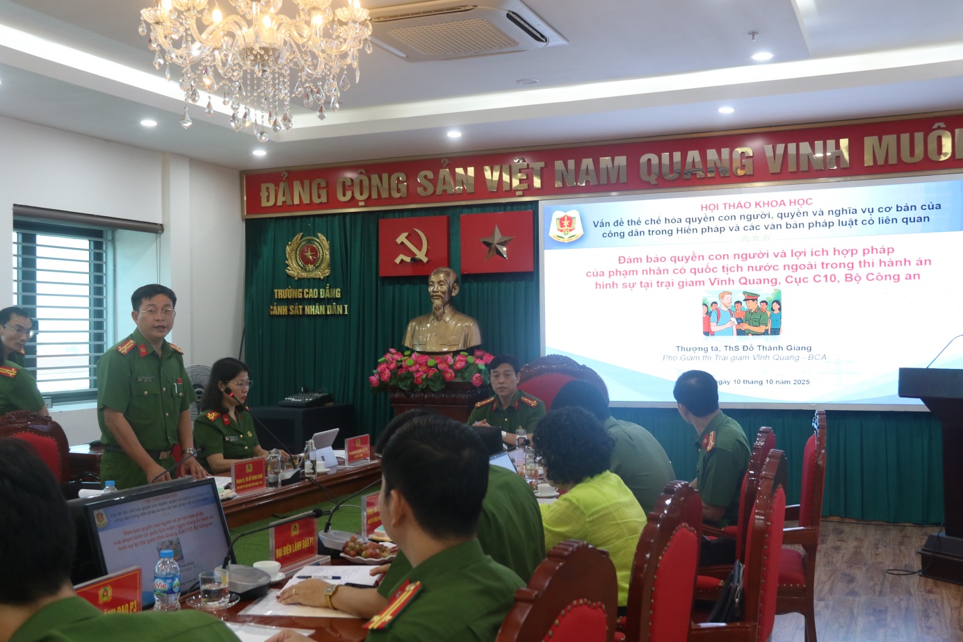 Chiều ngày 10/10/2025, Trường Cao đẳng CSND I tổ chức Hội thảo khoa học cấp cơ sở với chủ đề: “Vấn đề thể chế hóa quyền con người, quyền và nghĩa vụ cơ bản của công dân trong Hiến pháp và các văn bản pháp luật có liên quan”.