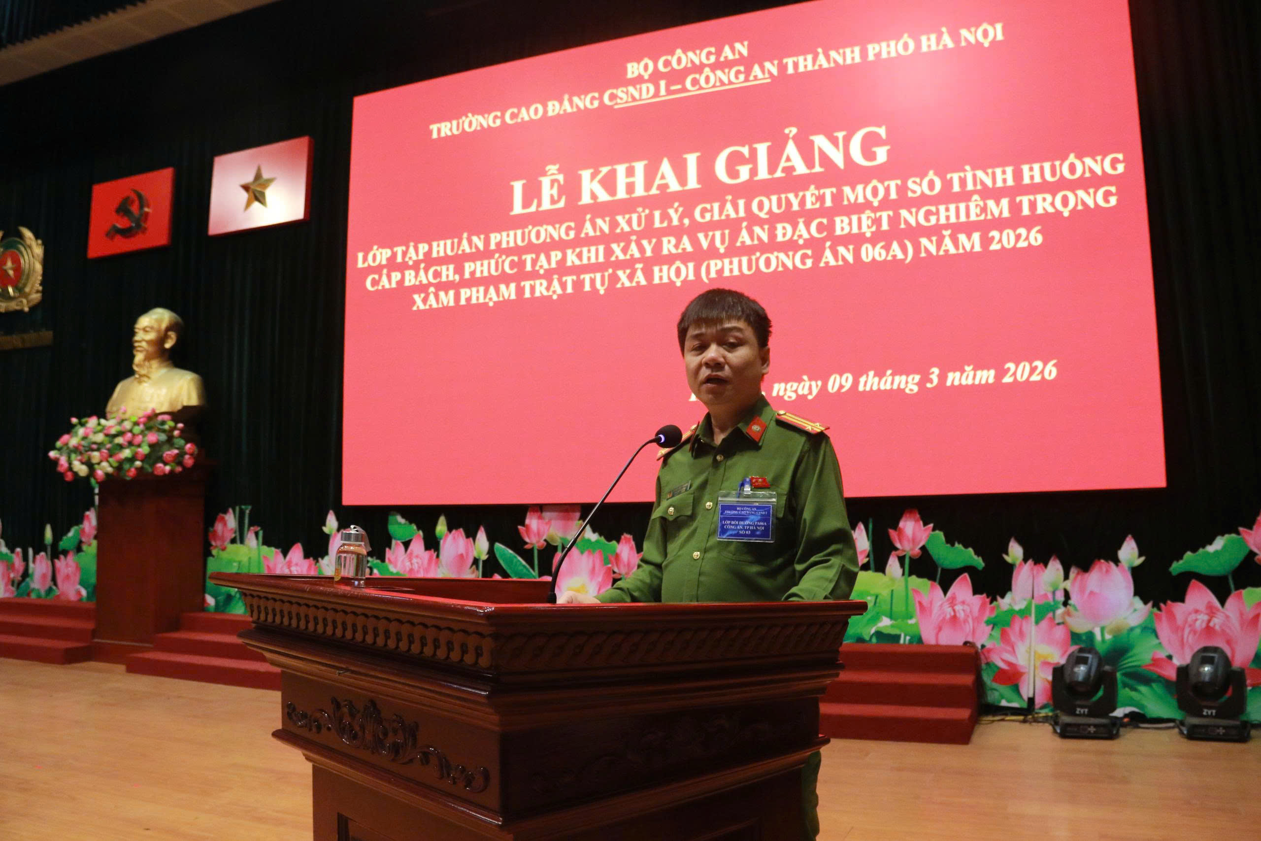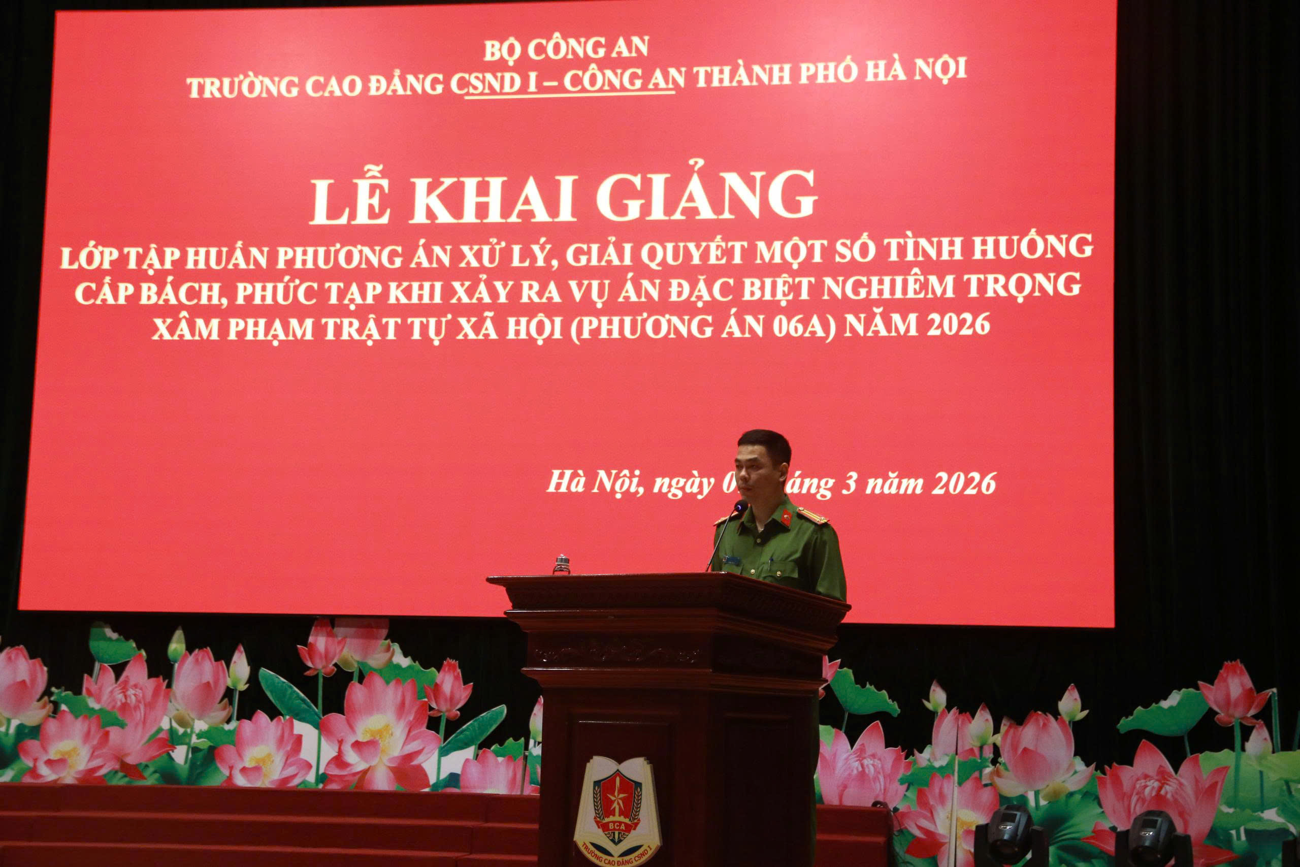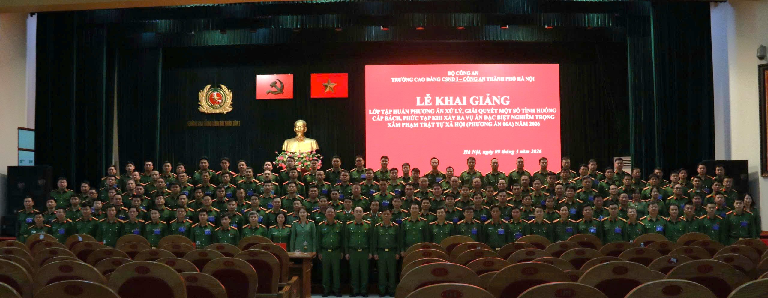 Thực hiện Kế hoạch của Trường Cao đẳng CSND I và Kế hoạch của Công an thành phố Hà Nội về việc tổ chức Tập huấn phương án xử lỷ, giải quyết một số tình huống cấp bách, phức tạp khi xảy ra vụ án đặc biệt nghiêm trọng xâm phạm trật tự xã hội cho Công an thành phố Hà Nội năm 2026. Ngày 09/3/2026, Trường Cao đẳng CSND I phối hợp với Công an thành phố Hà Nội tổ chức Lễ Khai giảng lớp số 01 Tập huấn Phương án 06A cho các đồng chí lãnh đạo Phòng Cảnh sát hình sự, Phòng Cảnh sát cơ động, chỉ huy, cán bộ Công an cấp xã - Công an thành phố Hà Nội.