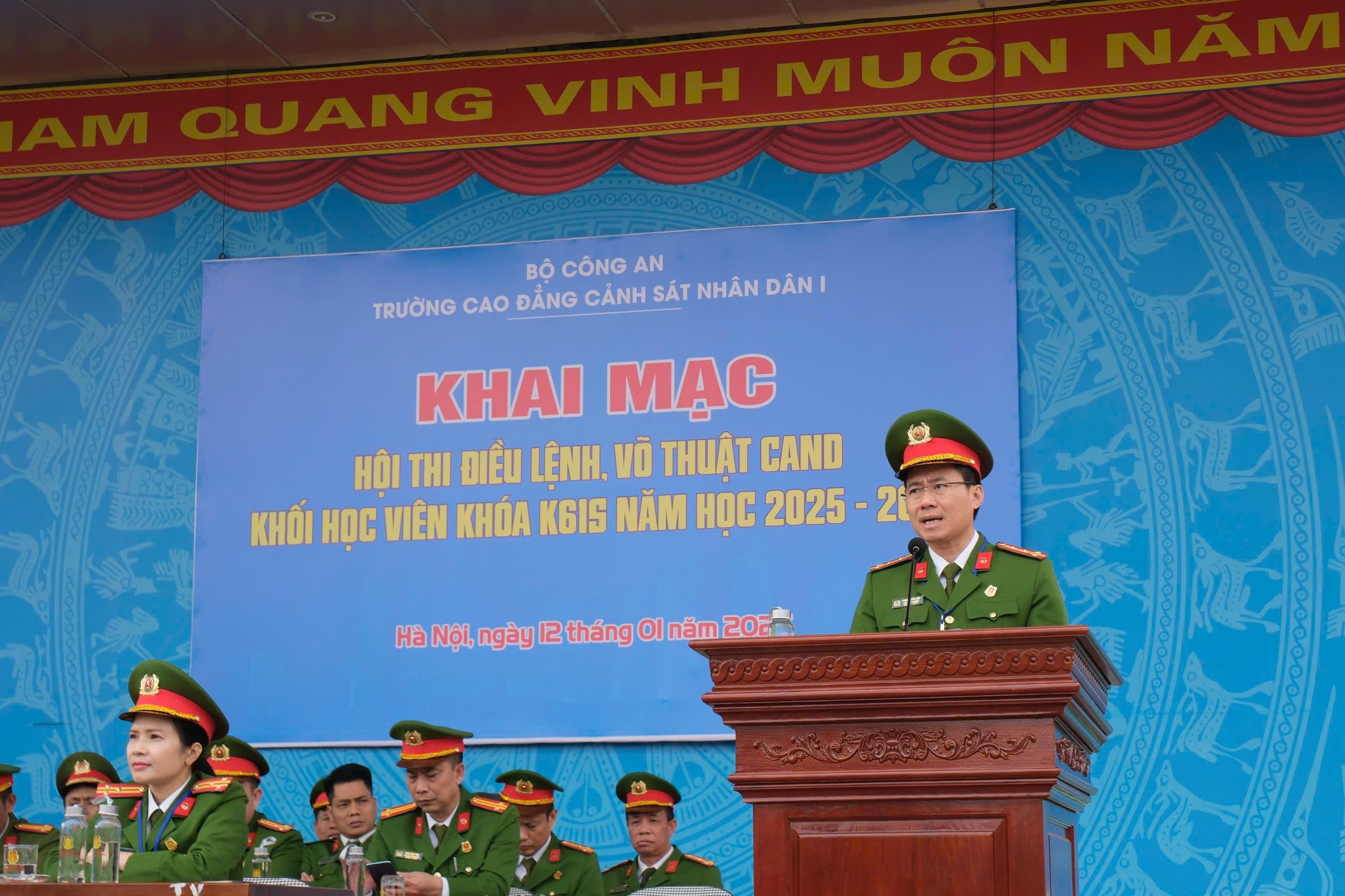 Phát biểu chỉ đạo tại Lễ khai mạc, đồng chí TS, Đại tá Phạm Tuấn Hiệp, Phó Hiệu trưởng nhấn mạnh: Điều lệnh, võ thuật CAND là nội dung huấn luyện cơ bản, có vai trò trực tiếp trong xây dựng lực lượng CAND chính quy, tinh nhuệ, hiện đại. Đối với học viên khóa K61S, Hội thi không chỉ là dịp để thể hiện kết quả rèn luyện, mà còn là môi trường giáo dục thực tiễn về ý thức tổ chức kỷ luật, tinh thần tập thể, bản lĩnh và tác phong người cán bộ CAND. Thông qua Hội thi, Nhà trường tiếp tục siết chặt kỷ luật, kỷ cương, tạo chuyển biến rõ nét về tư thế, lễ tiết, tác phong chính quy cho học viên; đồng thời yêu cầu Ban Tổ chức, Ban Giám khảo tổ chức Hội thi nghiêm túc, khách quan, đúng điều lệ; học viên tham gia với tinh thần trách nhiệm cao, bảo đảm an toàn tuyệt đối.