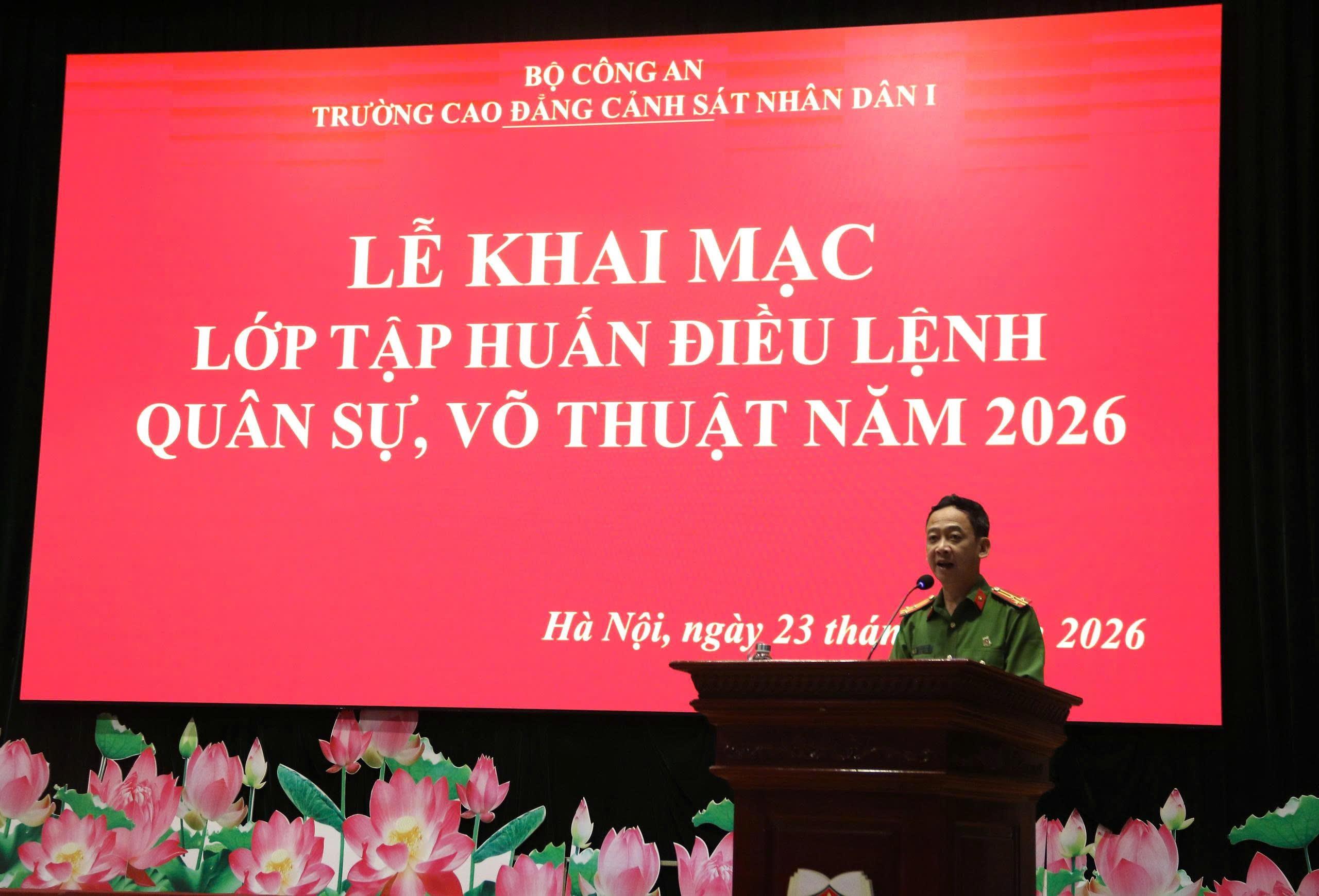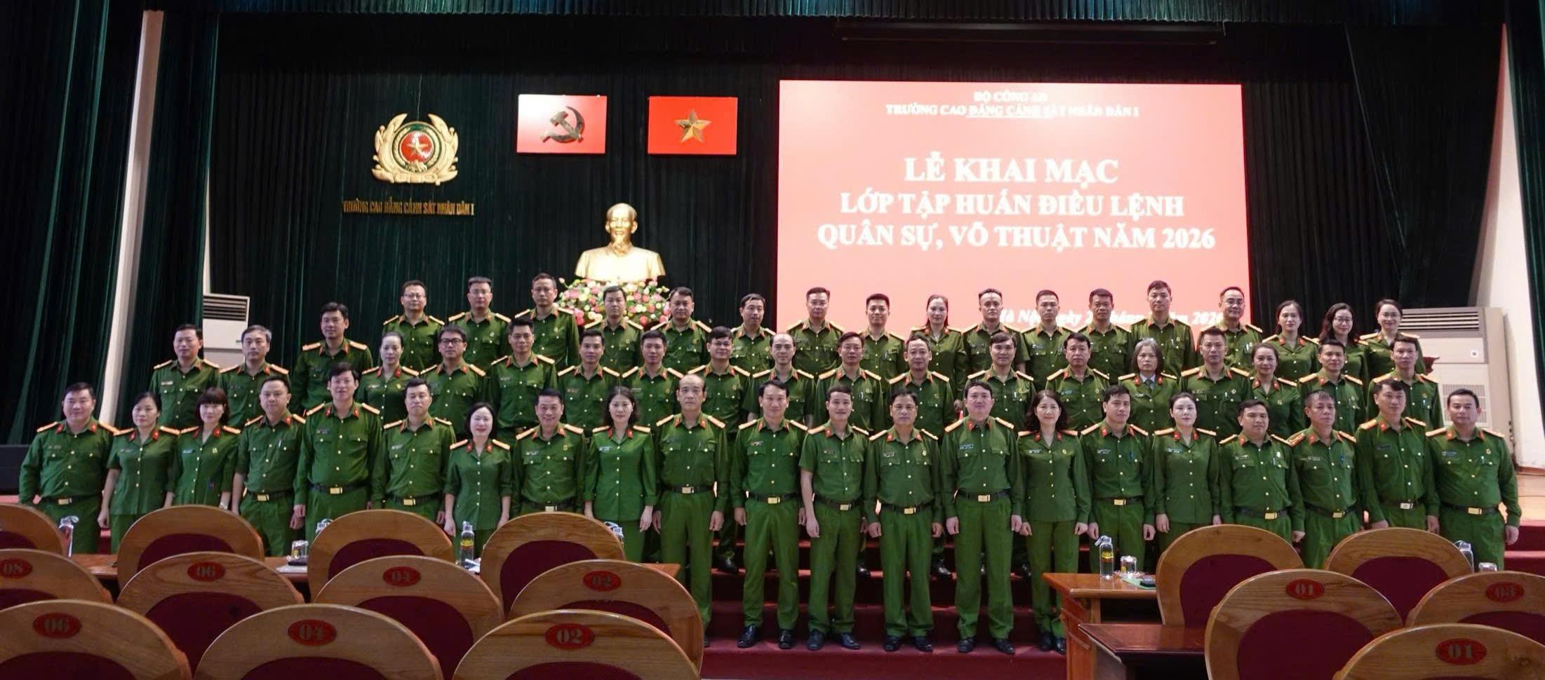 Trong những năm qua, Trường Cao đẳng Cảnh sát nhân dân I đã triển khai nghiêm túc các quy định của Bộ Công an về công tác điều lệnh, quân sự, võ thuật; tổ chức tập huấn bài bản, khoa học, đạt nhiều kết quả tích cực. Qua đó đã tạo chuyển biến rõ nét về nhận thức và hành động của cán bộ, giáo viên, công nhân viên trong toàn Trường, góp phần nâng cao chất lượng giáo dục, đào tạo và hoàn thành tốt nhiệm vụ chính trị được giao. Lớp tập huấn năm 2026 được tổ chức nhằm tiếp tục quán triệt sâu sắc các quy định mới của Bộ Công an; đồng thời nâng cao trình độ, kỹ năng thực hành điều lệnh, quân sự, võ thuật gắn với yêu cầu thực tiễn công tác, giảng dạy và chiến đấu.