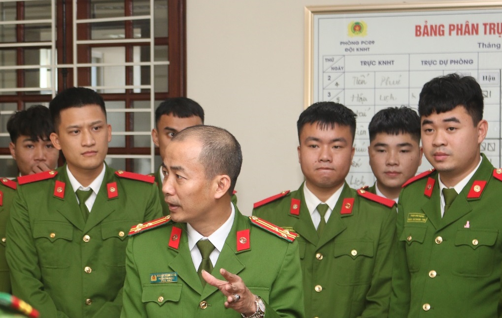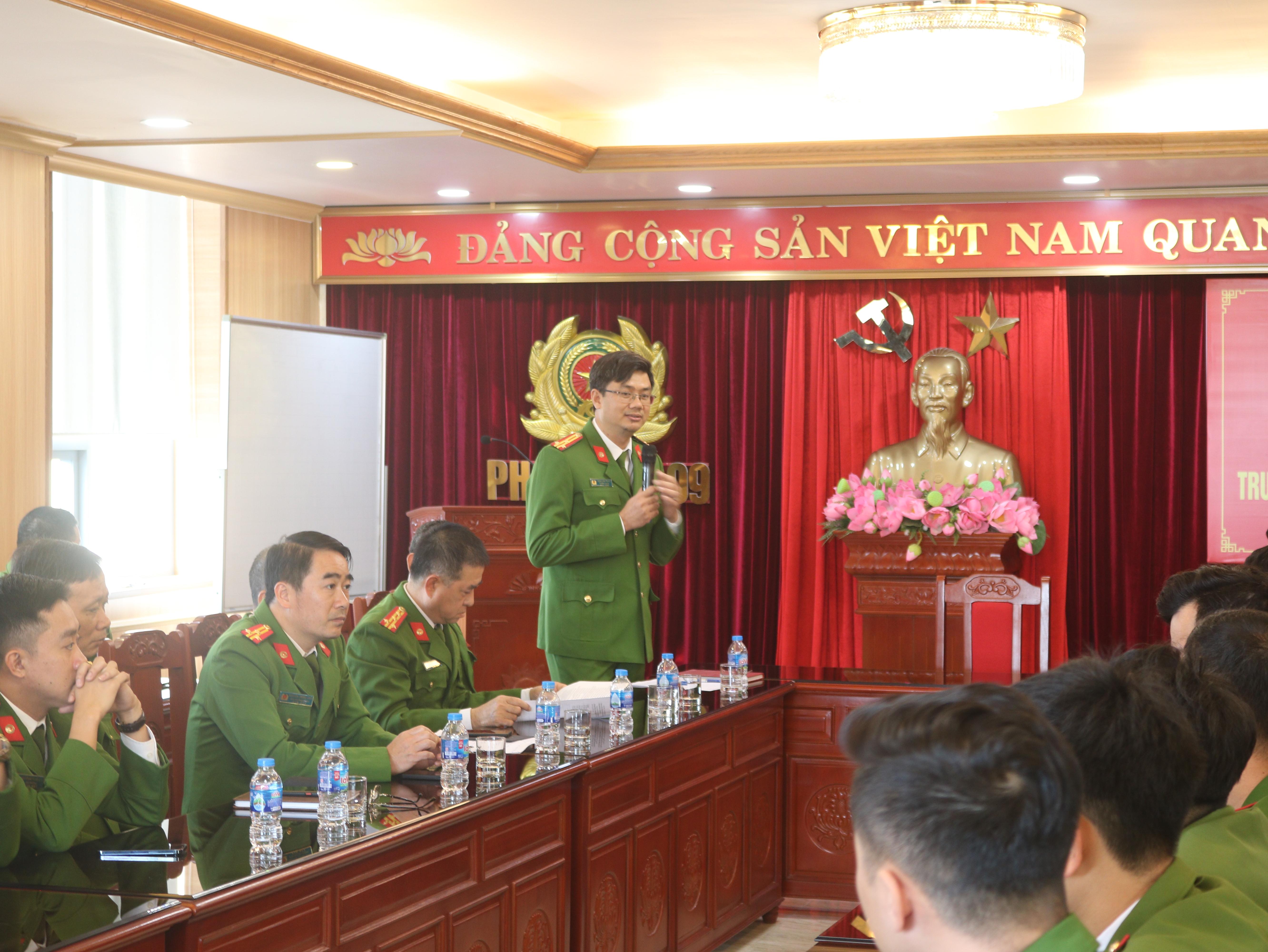 Đồng chí Thượng tá Nguyễn Mạnh Hùng, Phó Trưởng phòng Kỹ thuật hình sự báo cáo thực tế công tác nghiệp vụ của phòng Kỹ thuật hình sự.