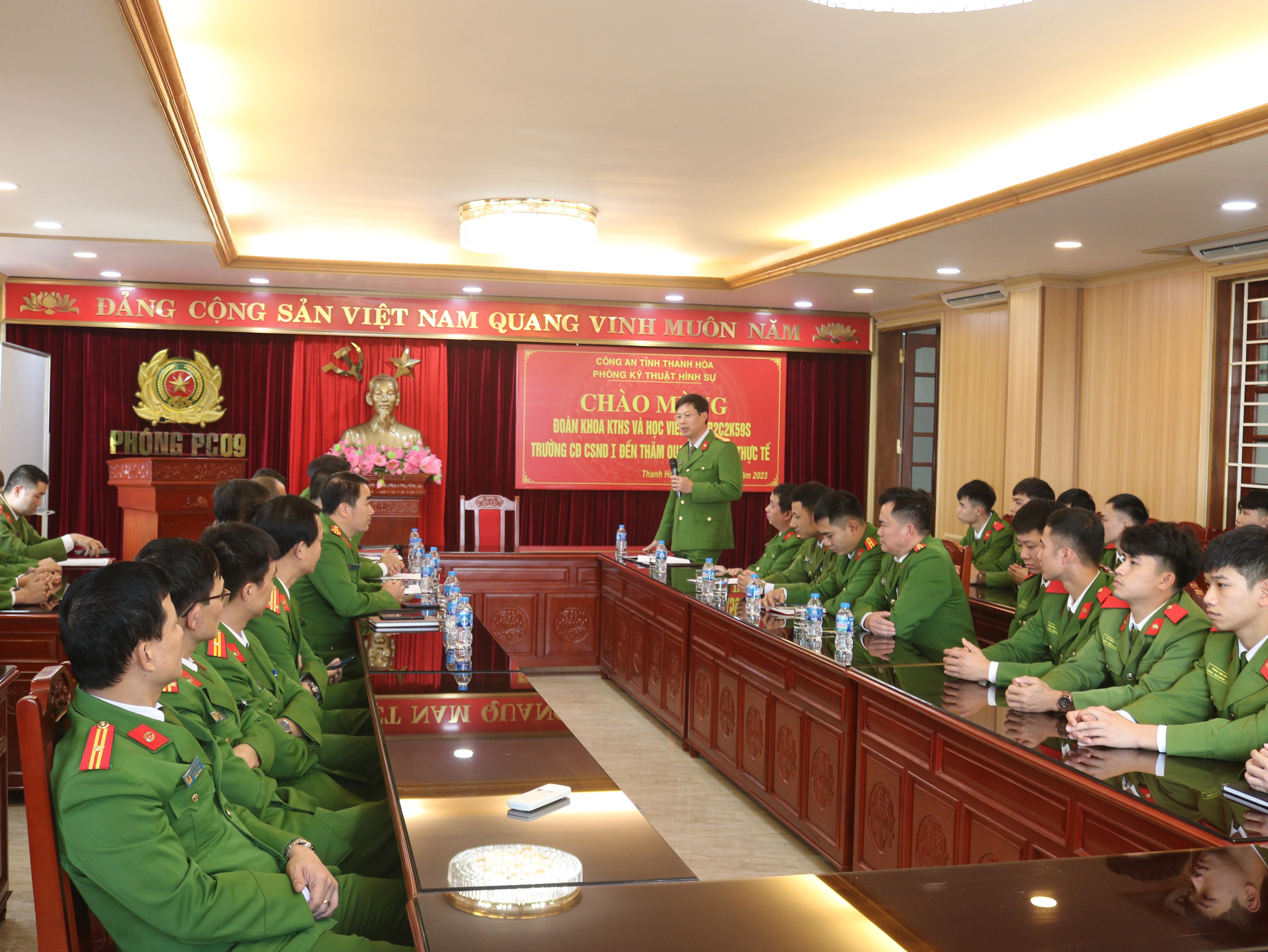 Buổi làm việc có đại diện lãnh đạo, tập thể giáo viên khoa Kỹ thuật hình sự, học viên lớp B2C2K59S và lãnh đạo, cán bộ, chiến sĩ phòng Kỹ thuật hình sự, Công an tỉnh Thanh Hóa. Tại buổi làm việc, đồng chí Thượng tá, TS Vũ Duy Long, Trưởng khoa Kỹ thuật hình sự đã giới thiệu về khoa Kỹ thuật hình sự nói riêng và Trường Cao đẳng Cảnh sát nhân dân I nói chung; cơ cấu tổ chức, hoạt động của khoa Kỹ thuật hình sự và tặng quà cho phòng Kỹ thuật hình sự, Công an tỉnh Thanh Hóa.