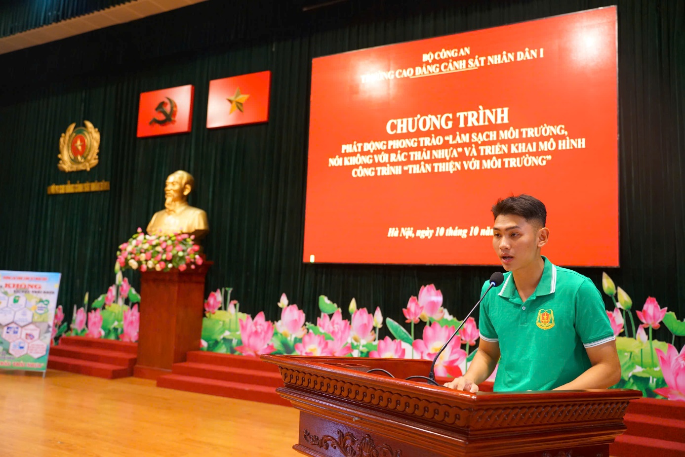 Phát biểu phát động phong trào, đồng chí TS, Đại tá Phạm Tuấn Hiệp, Phó Hiệu trưởng đã nhấn mạnh: “Môi trường là vấn đề sống còn của đất nước, của nhân loại, là nhân tố bảo đảm sức khỏe và chất lượng cuộc sống của nhân dân. Ô nhiễm môi trường không chỉ là vấn đề sinh thái mà còn là mối đe doạ an ninh phi truyền thống. Phong trào “Làm sạch môi trường, nói không với rác thải nhựa” không chỉ là hành động cụ thể nhằm gìn giữ môi trường sống xanh - sạch - đẹp mà còn thể hiện tinh thần trách nhiệm, bản lĩnh tiên phong của mỗi cán bộ, giáo viên và học viên Trường Cao đẳng CSND I chung tay bảo vệ môi trường”. Đồng thời đồng chí Phó Hiệu trưởng quán triệt các mục tiêu, yêu cầu của chương trình phát động và đề nghị lãnh đạo các đơn vị, tổ chức quần chúng, cán bộ, giáo viên, công nhân viên và học viên nhà trường cần nâng cao tinh thần trách nhiệm, hành động cụ thể, thiết thực, hiệu quả.