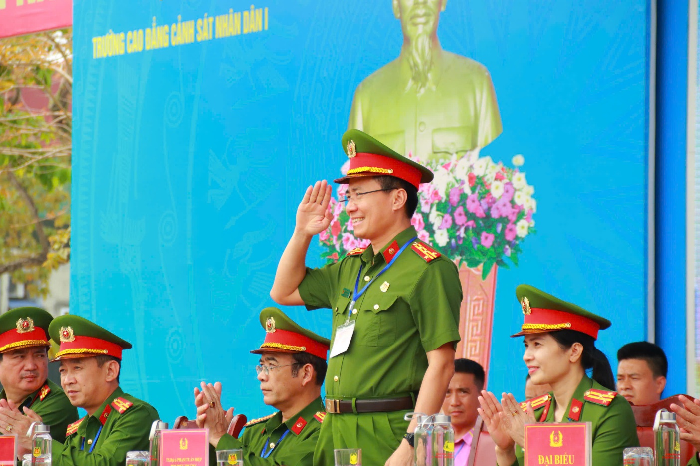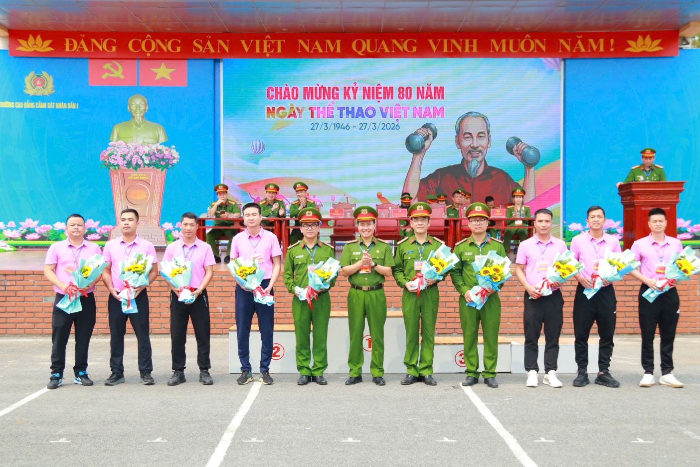 Đồng chí TS, Đại tá Phạm Tuấn Hiệp, Phó Hiệu trưởng tặng hoa chúc mừng Tổ trọng tài nhân kỷ niệm 80 năm ngày Thể thao Việt Nam.