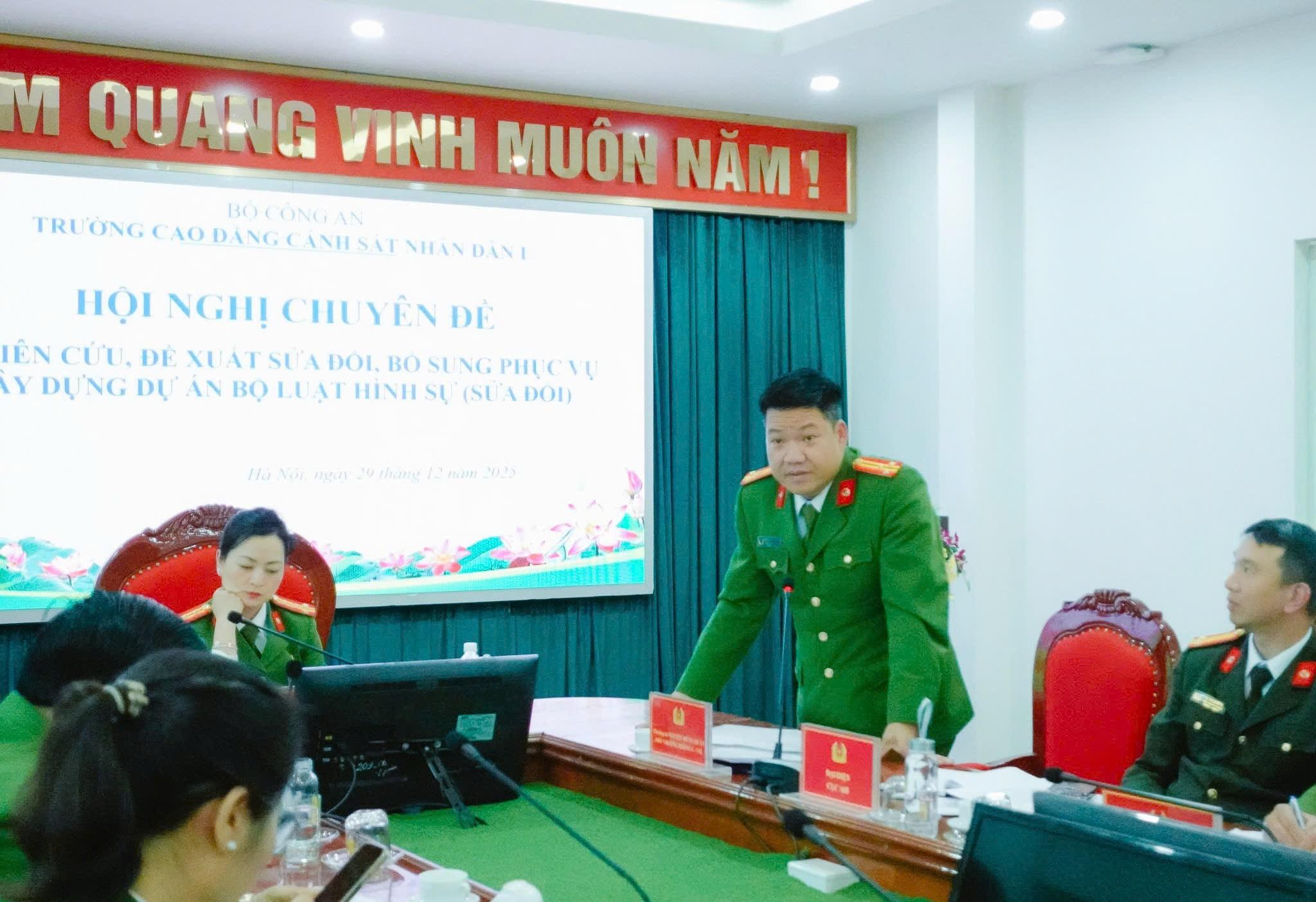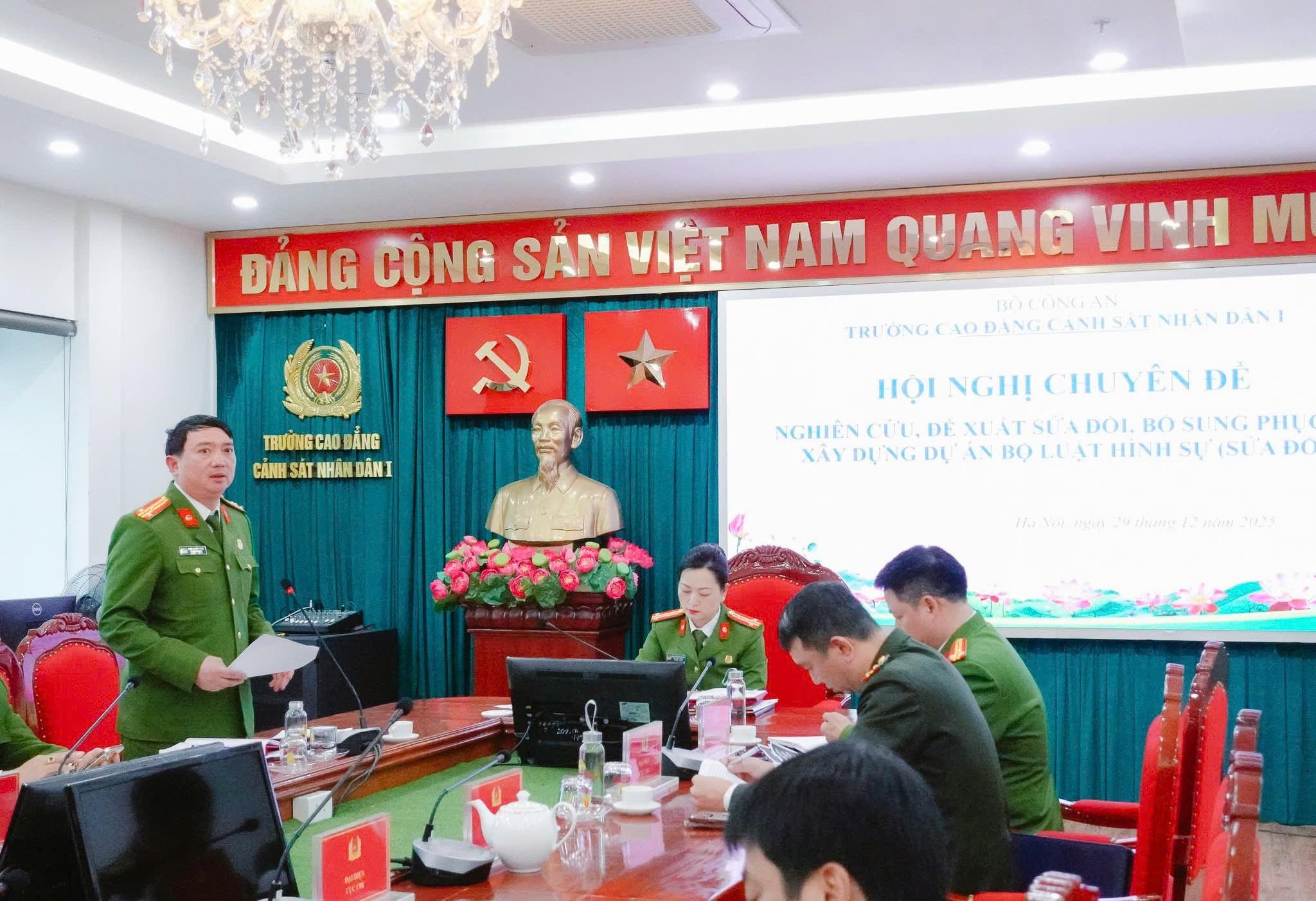 Thực hiện chủ trương của Đảng, Nhà nước và Bộ Công an về tiếp tục hoàn thiện hệ thống pháp luật Hình sự, đáp ứng yêu cầu cải cách tư pháp và đấu tranh phòng, chống tội phạm trong tình hình mới, chiều ngày 29/12/2025, Trường Cao đẳng Cảnh sát nhân dân I tổ chức Hội nghị chuyên đề “Nghiên cứu, đề xuất sửa đổi, bổ sung phục vụ xây dựng dự án Bộ luật Hình sự (sửa đổi)”.