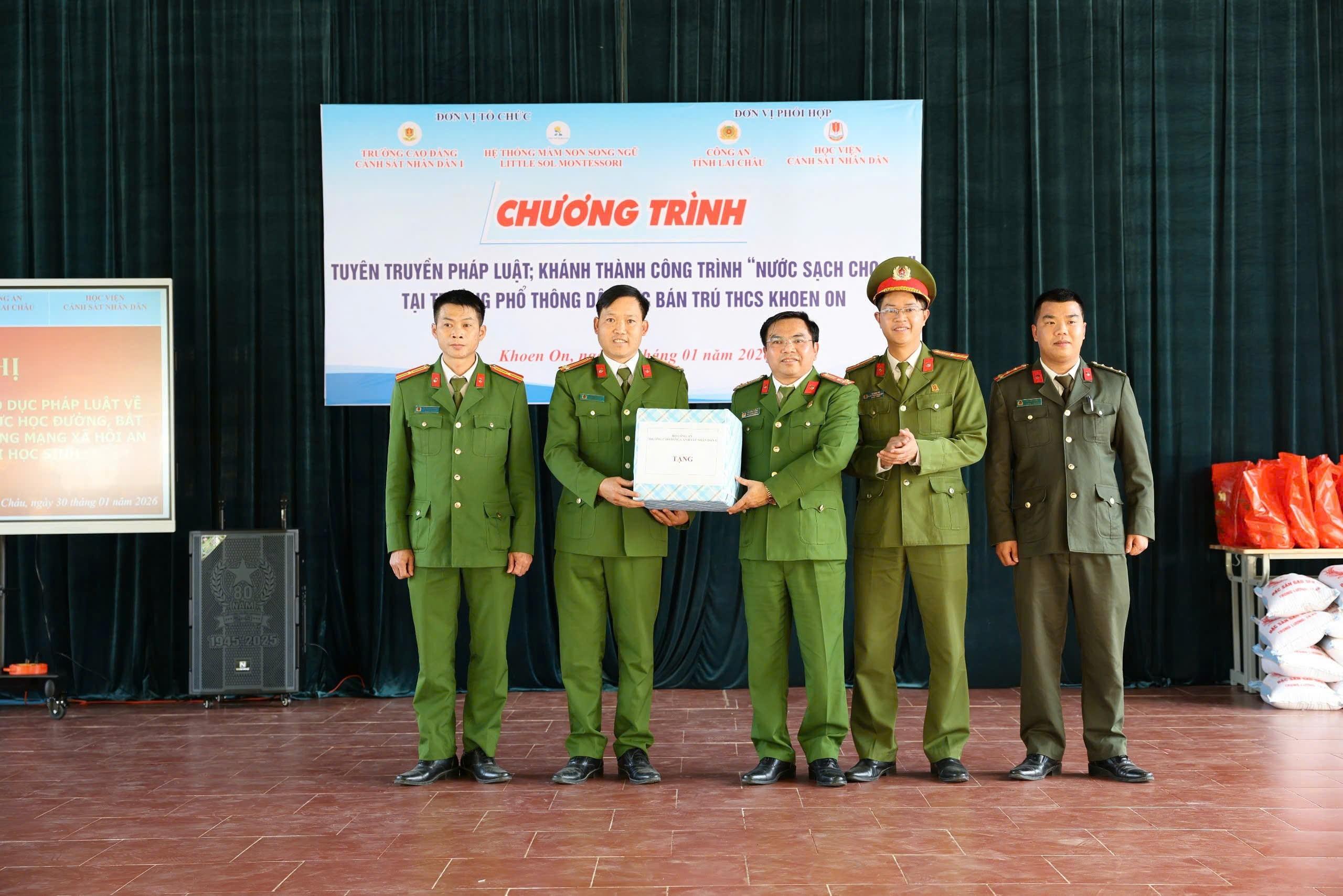 Thực hiện chương trình công tác năm học 2025 - 2026 và hưởng ứng phong trào thi đua “Ba nhất: Kỷ luật nhất - Trung thành nhất - Gần dân nhất", từ ngày 30/01 đến 01/02/2026, Trường Cao đẳng Cảnh sát nhân dân I phối hợp với các đơn vị đồng hành tổ chức chương trình tuyên truyền pháp luật, trao tặng các công trình an sinh xã hội tại xã Khoen On, tỉnh Lai Châu.