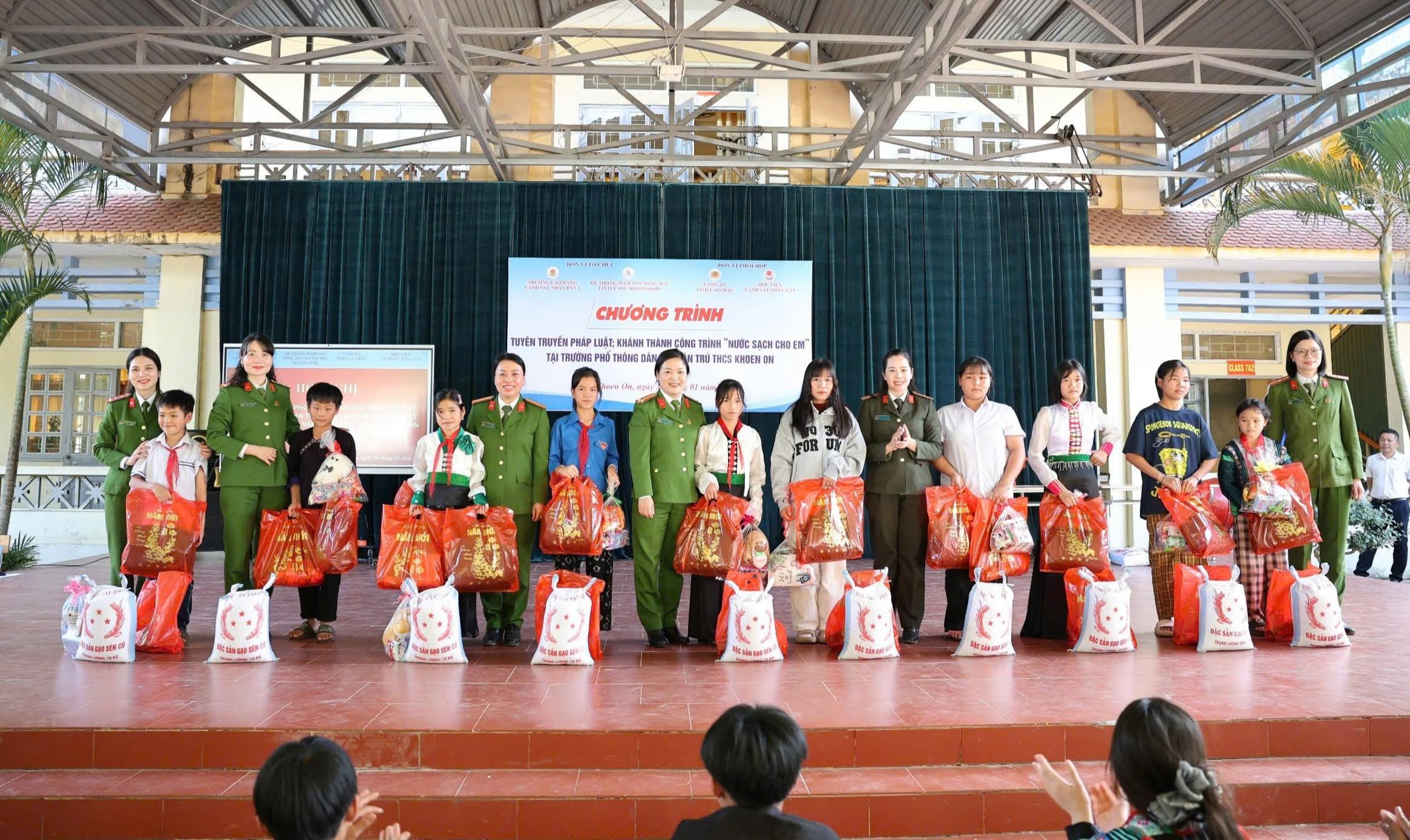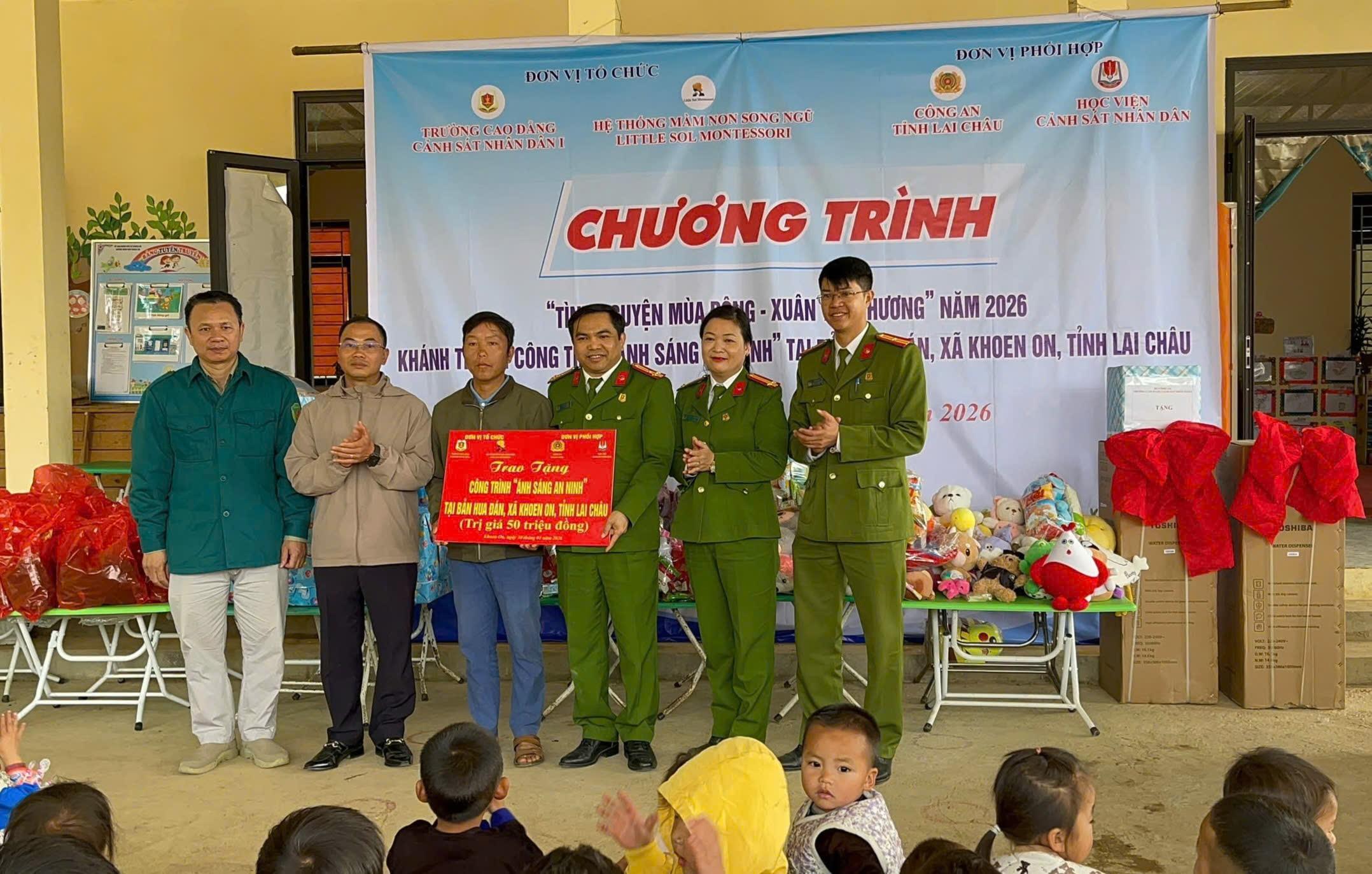Trong khuôn khổ chương trình, nhiều hoạt động an sinh xã hội thiết thực được triển khai, hướng về đồng bào và học sinh vùng cao còn nhiều khó khăn. Nhà trường tổ chức trao tặng công trình “Nước sạch cho em” - hệ thống lọc nước RO phục vụ gần 500 học sinh Trường Phổ thông Dân tộc bán trú THCS Khoen On; trao tặng công trình “Ánh sáng an ninh” tại bản Hua Đán. Bên cạnh đó, hơn 4.000 áo ấm cùng các quà tặng đã được trao tận tay các em học sinh tại các điểm trường; 50 phần quà Tết được gửi tới các gia đình chính sách, hộ gia đình có hoàn cảnh đặc biệt khó khăn và học sinh vượt khó, vươn lên học tốt; cùng những phần quà động viên lực lượng Công an xã Khoen On. Tổng trị giá quà tặng gần 200 triệu đồng.
