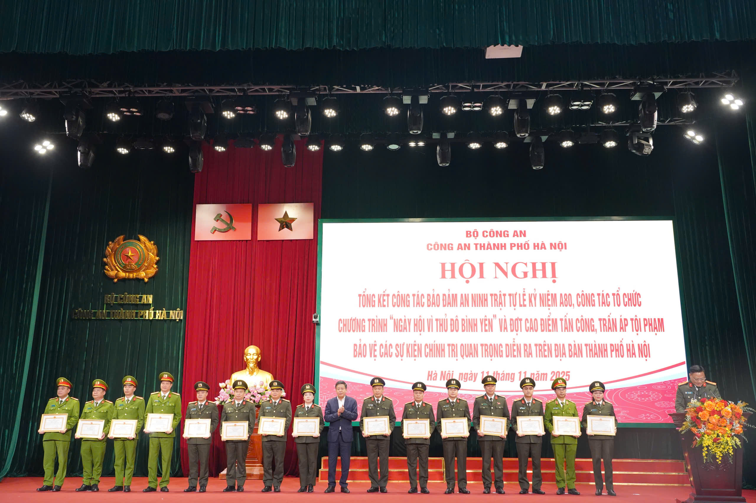 Chiều 11/11/2025, Công an thành phố Hà Nội tổ chức Hội nghị tổng kết công tác bảo đảm ANTT Lễ kỷ niệm A80, công tác tổ chức chương trình “Ngày hội vì Thủ đô bình yên” và đợt cao điểm tấn công, trấn áp tội phạm bảo vệ các sự kiện chính trị quan trọng diễn ra trên địa bàn thành phố Hà Nội. Trung tướng Nguyễn Thanh Tùng, Giám đốc Công an thành phố Hà Nội chủ trì Hội nghị.