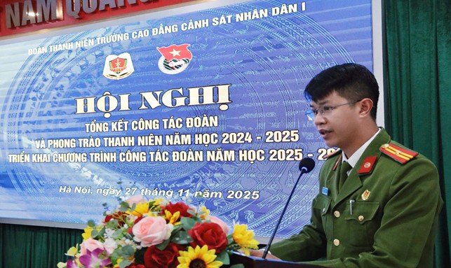 Trong phần báo cáo tổng kết, đồng chí Võ Hữu Vũ, Bí thư Đoàn Trường, đã trình bày kết quả công tác Đoàn và phong trào thanh niên năm học 2024 - 2025. Năm học diễn ra trong bối cảnh toàn lực lượng CAND triển khai nhiều chủ trương lớn của Đảng, Nhà nước và Ngành; Nhà trường thực hiện Đề án phát triển đến năm 2030, tầm nhìn 2045 và chuỗi hoạt động hướng tới kỷ niệm 60 năm truyền thống Trường Cao đẳng CSND I.